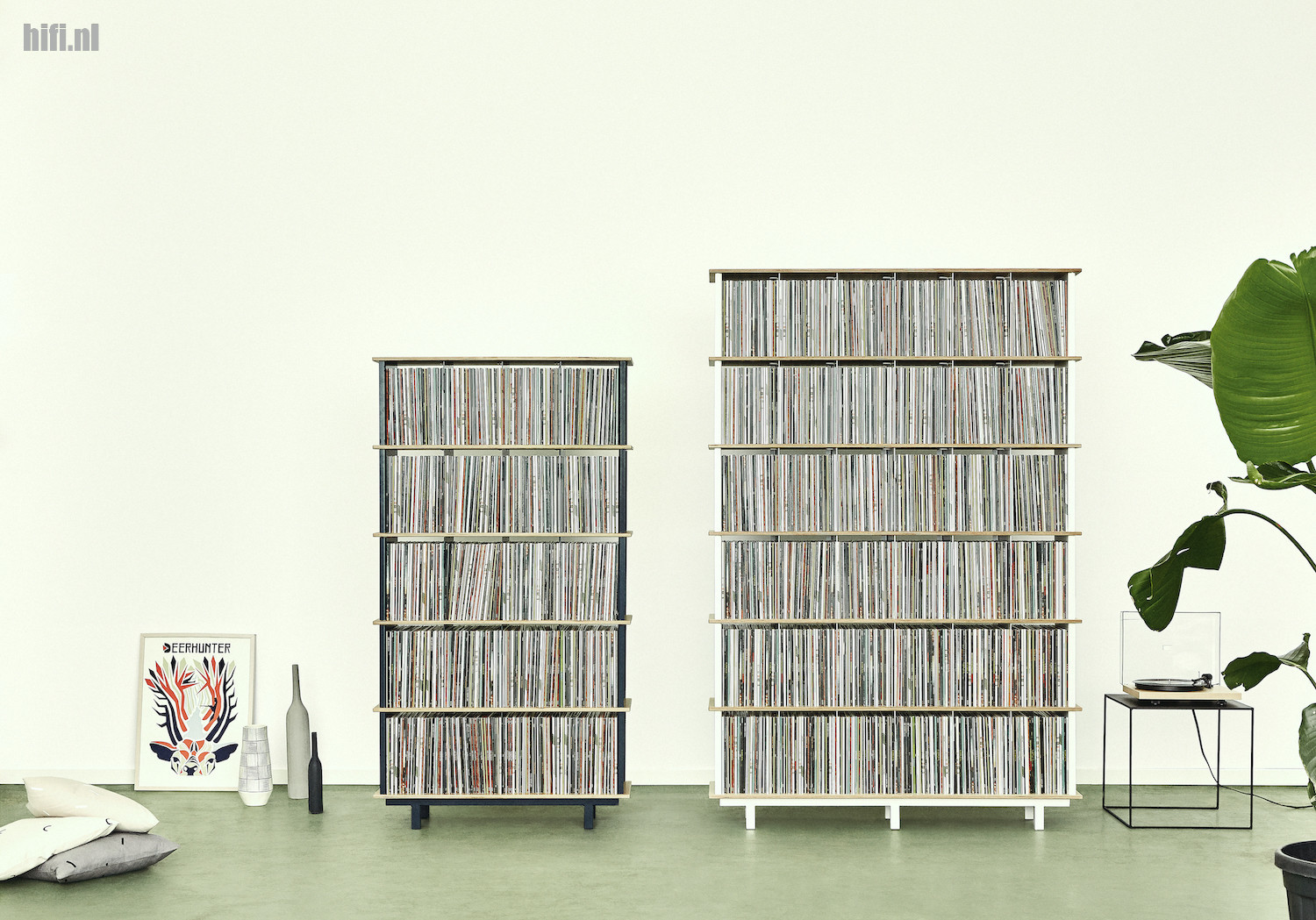 De hoogte is op papier enkel beperkt door je plafond, want het ontwerp en de materiaalkeuze staan garant voor een draagkracht die iedere toepassing moeiteloos aan moet kunnen. In de praktijk is vijf (Small) respectievelijk zes (Large) lagen evenwel de maximaal geadviseerde uitbouw, tenzij je ergens een klassieke bibliotheekladder vandaan wil halen om de toplaag nog enigszins binnen handbereik te houden (5 lagen Small komt tot 1 meter 92; 6 lagen Large meet 2 meter 28 hoog). We vermoeden dat een twee- of drielaags model sowieso de meest gebruikelijke variant zal zijn, al dan niet aangevuld met die platenspeler, een paar mooie planten of natuurlijk gewoon een televisie. Deze kast mag namelijk prominent in de living geplaatst worden en maakt van jouw verzameling zwart goud een collectie die gezien mag worden, in plaats van je hobby te verbannen naar opbergkasten in de periferie van je woonkamer, een Billie op de overloop of – nog erger – stoffige dozen op zolder. Vinyl is een lifestyle, nietwaar?
