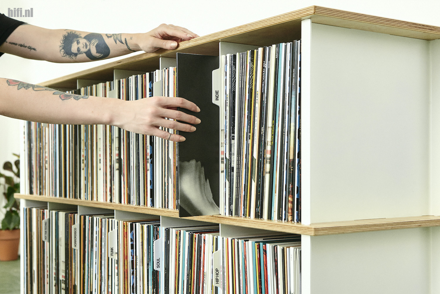 Het eerste wat opvalt aan deze ‘demokast’ – eentje goed gevuld met lege platenhoezen waarbij we ook een paar dubbele exemplaren spotten – is het gegeven dat modulair bij For The Record geen compromis voor design is gebleken. Nu hadden we dat ook nergens verwacht, bij het team dat er ook in de andere ondernemingen naar streeft om een bron van inspiratie te zijn door rondom vinyl een hele levensstijl te creëren. For The Record mag namelijk een nieuwe (merk)naam zijn, moederbedrijf Swordfish & Friend draait al wat langer rond in platenland. “Vanuit die ervaring weten we als geen ander dat er bij veel liefhebbers behoefte is aan een vinylkast die met de collectie meegroeit”, legt Parlevliet uit. Als de kast te klein wordt omdat je je niet in kon houden bij een braderie, tijdens Record Store Day of op een zaterdagmiddag in de platenzaak en de verzameling weer eens is gegroeid, kan er simpelweg een nieuwe losse laag worden bijgeplaatst. "Het geheel is bovendien zeer toekomstbestendig."