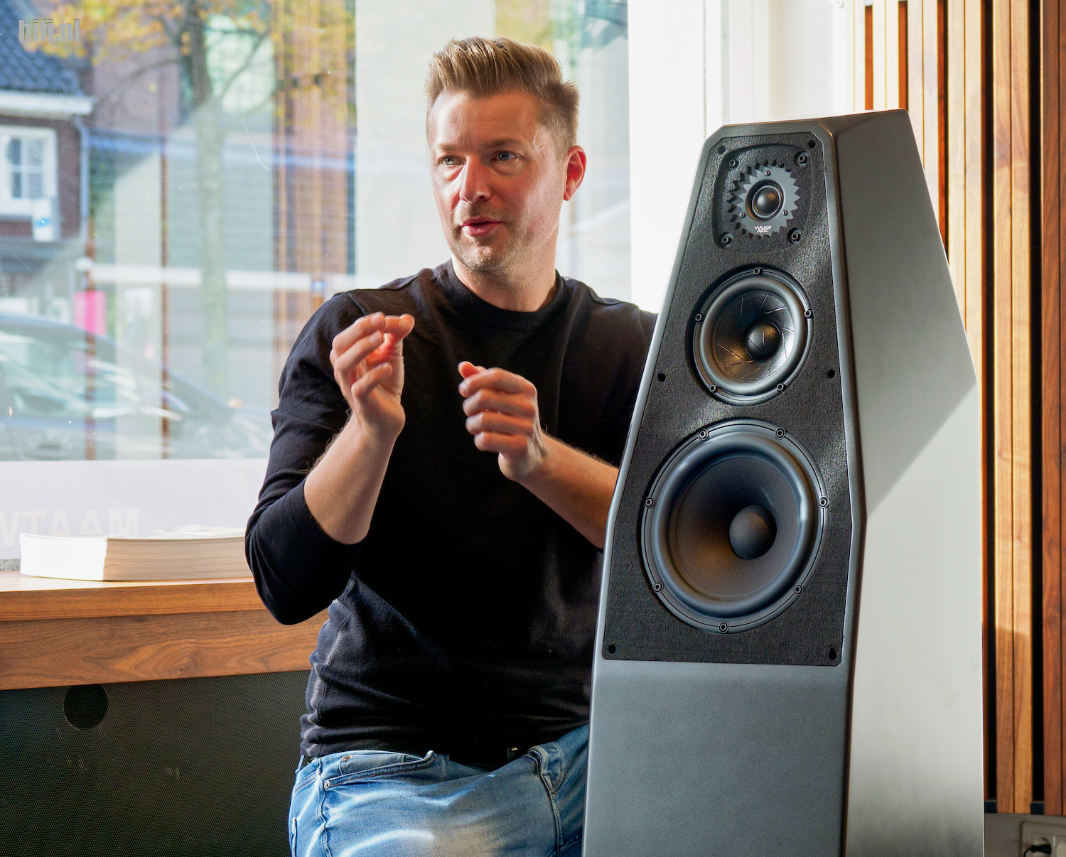 Via een set CrystalSpeak Ultra Diamond luidsprekerkabels van CrystalConnect is de Accuphase E-800 aangesloten op een paar Wilson Audio SabrinaX. Op uitnodiging van Rick kwam Michael Huigen (foto rechts, red.) van Wilson Audio importeur Reference Sounds ook nog langs om toelichting te geven over deze bijzondere luidsprekers. De X in de naam SabrinaX geeft aan dat deze nieuwe versie van de kleinste vloerstaander in het assortiment van Wilson Audio nu volledig is opgebouwd uit wat zij X-Material noemen. Dat is een geheime samenstelling van polymeren die een vrijwel perfecte balans heeft tussen stijfheid en inwendige demping.