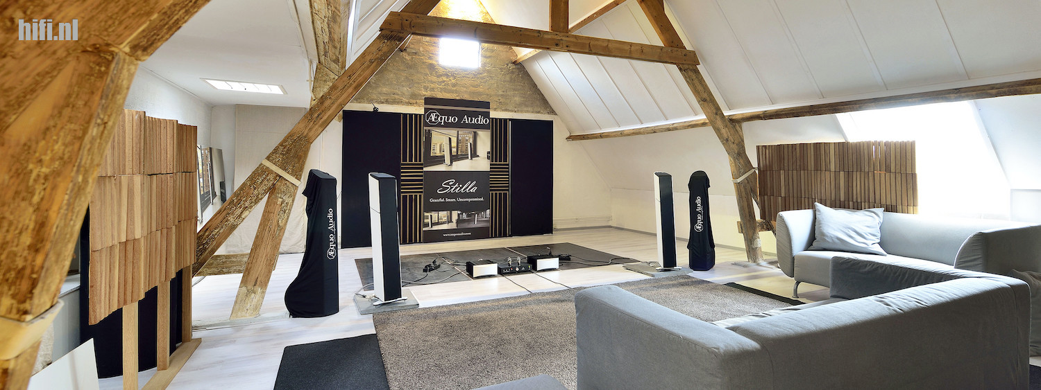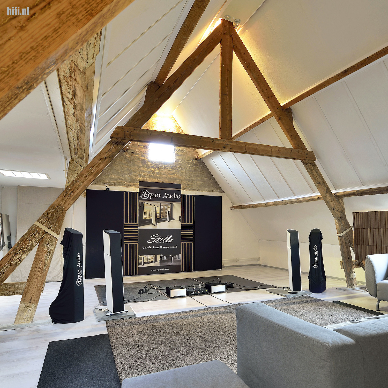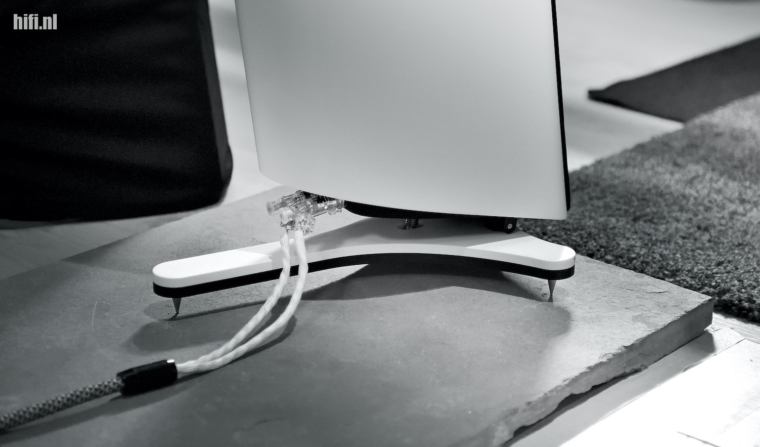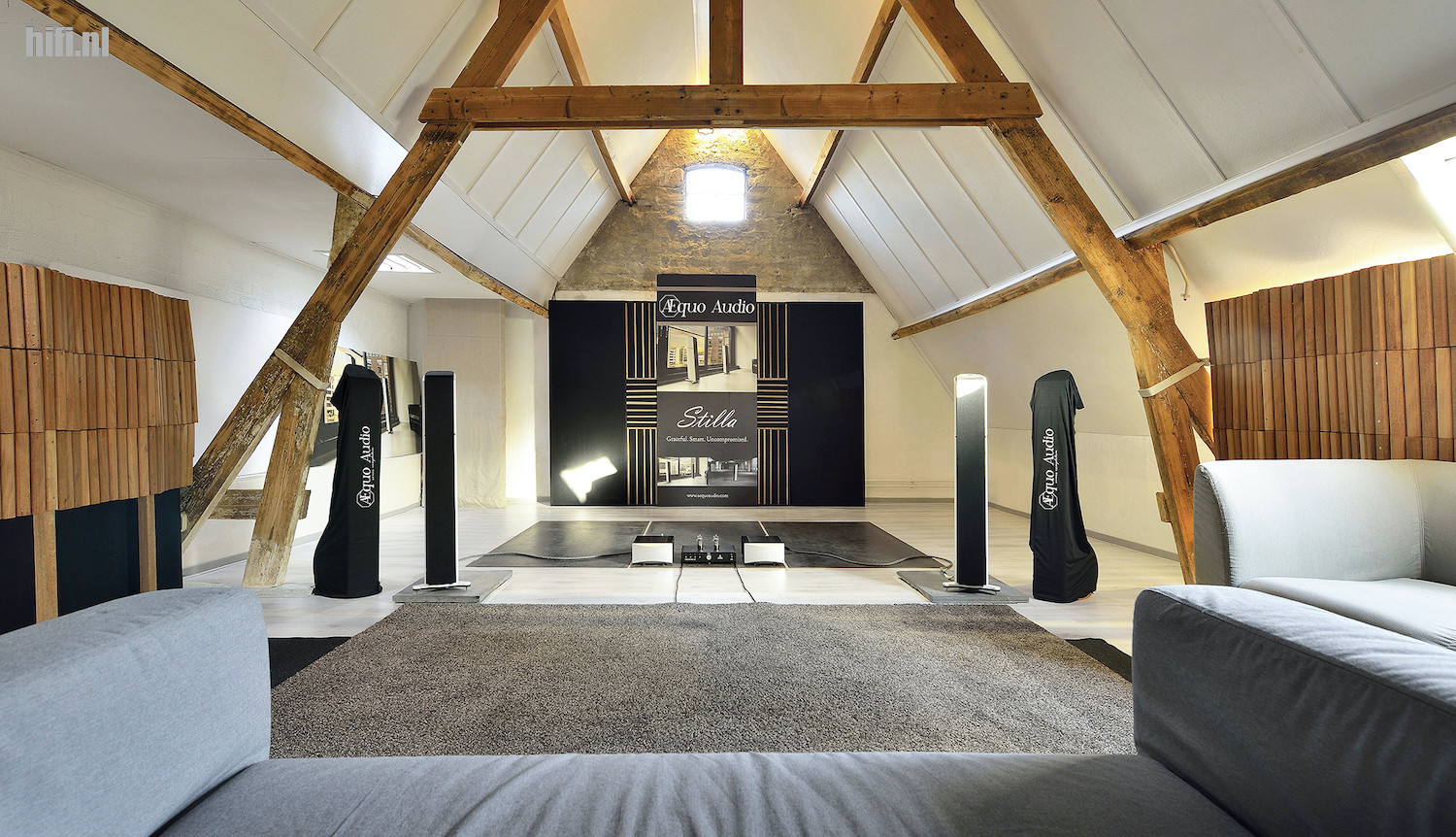 With all these nice words in the back of my mind, we walk back to the big listening room and take a seat in the strategically placed couches, accompanied by a nice cup of steaming hot tea. The hybrid Elemental Stilla in the showcased setup (standard in white, wood veneers and coloured lacquers are optional) costs € 17.999,-, while for a fully active version you spend € 19.999,-. A lot of money for a beautiful and, in this room especially, compact structure. Would they be capable of filling this large and spacious room?