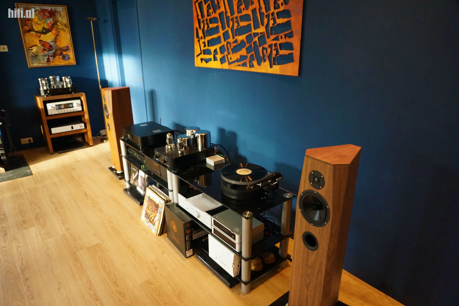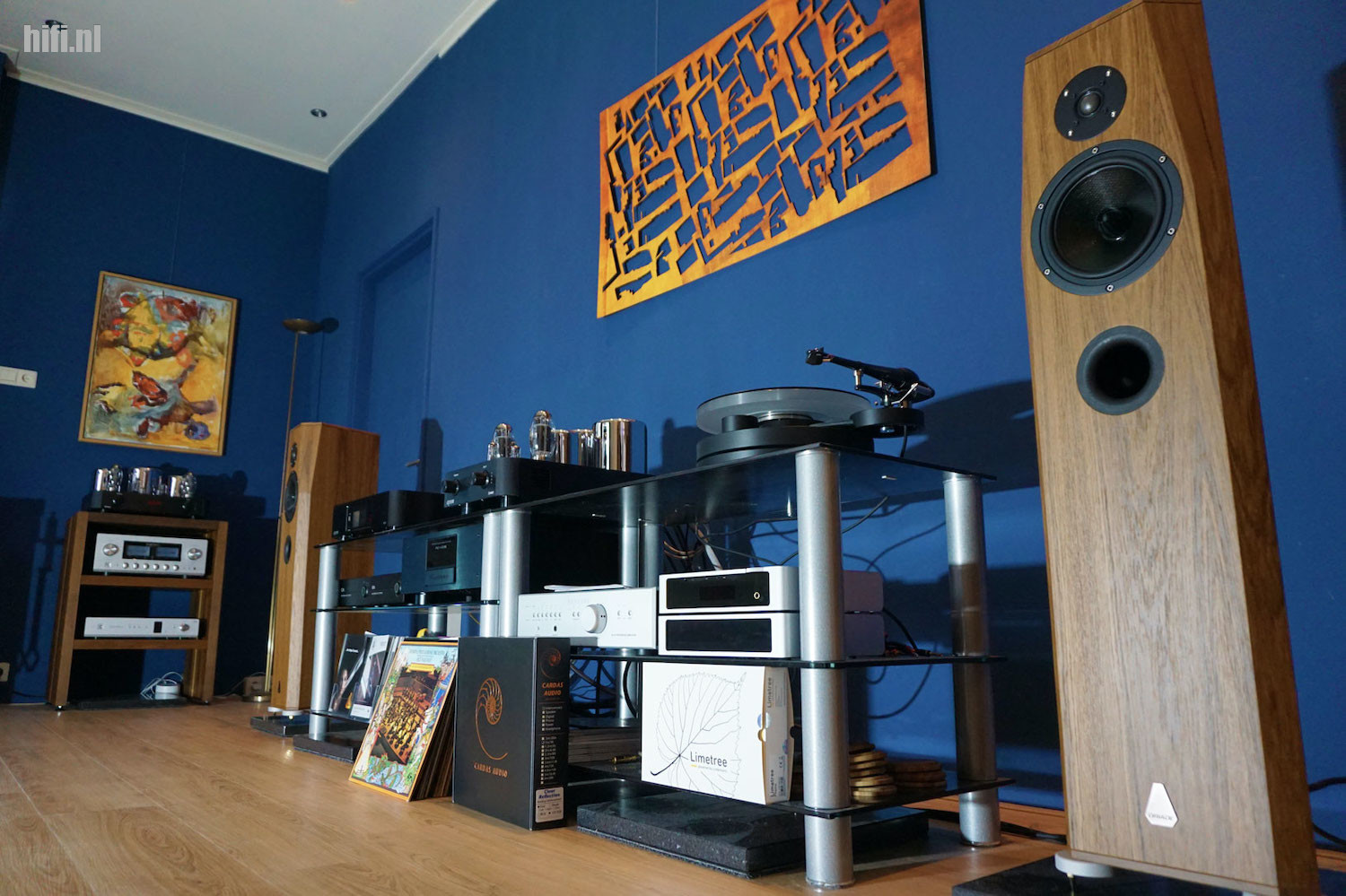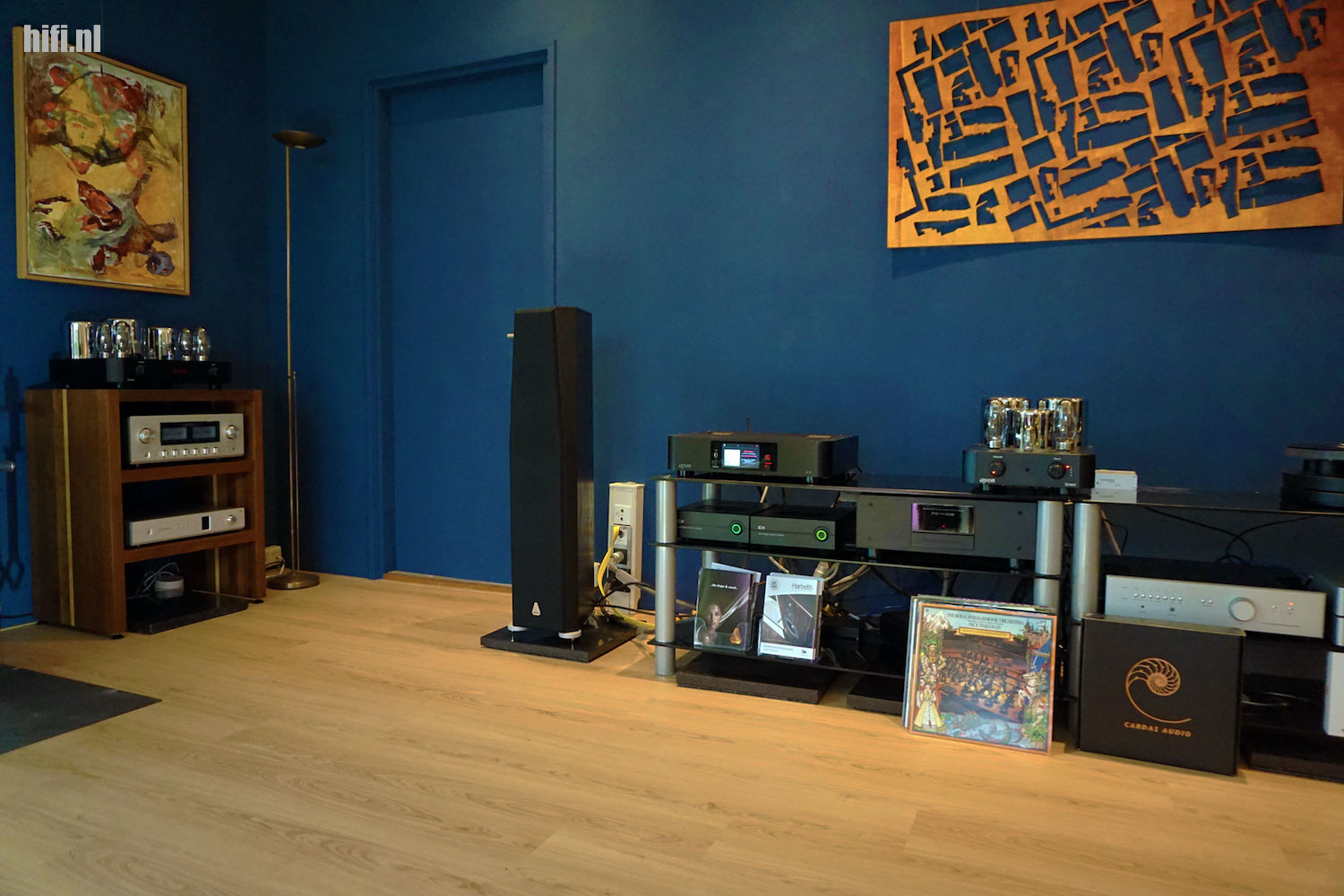 Het grote vloeroppervlak heeft als voordeel dat lage tonen de ruimte krijgen die nodig is. Rondlopend als er muziek speelt geeft een heel rustig beeld zonder akoestische pieken en dalen vanuit een verstoorde frequentiebalans met staande golven. Het niet overmatig dempen van de ruimte heeft tot gevolg dat levendigheid in de muziek behouden blijft en dynamiek niet verdwijnt in de wandbekleding. Ook niet in de vloer waar een houten toplaag een kurk ondergrond verbergt. Achter de dichte achterwand waar het rek voor staat zit een kleinere kamer. Het plan is er om die ruimte om te toveren tot een kleinere luisterruimte waar kleine, hoogwaardige monitoren meer op hun plaats zullen zijn. Schelto heeft alles aangepakt, het ethernet en de stroomvoorziening door nieuwe bekabeling te laten trekken en in de schakelkast te werken met een Gigawatt meterkastschakelaar en Doepke Audio Grade schakelmateriaal. Naast het rek zit nog steeds een gewone wandcontactdoos, zonder speciale bekabeling of Doepke/Gigawatt materiaal, zodat het verschil tussen een audiogroep en een normale stroomgroep hoorbaar aan te tonen is.