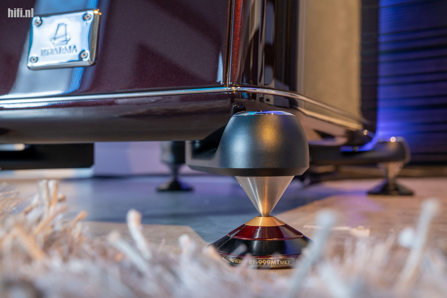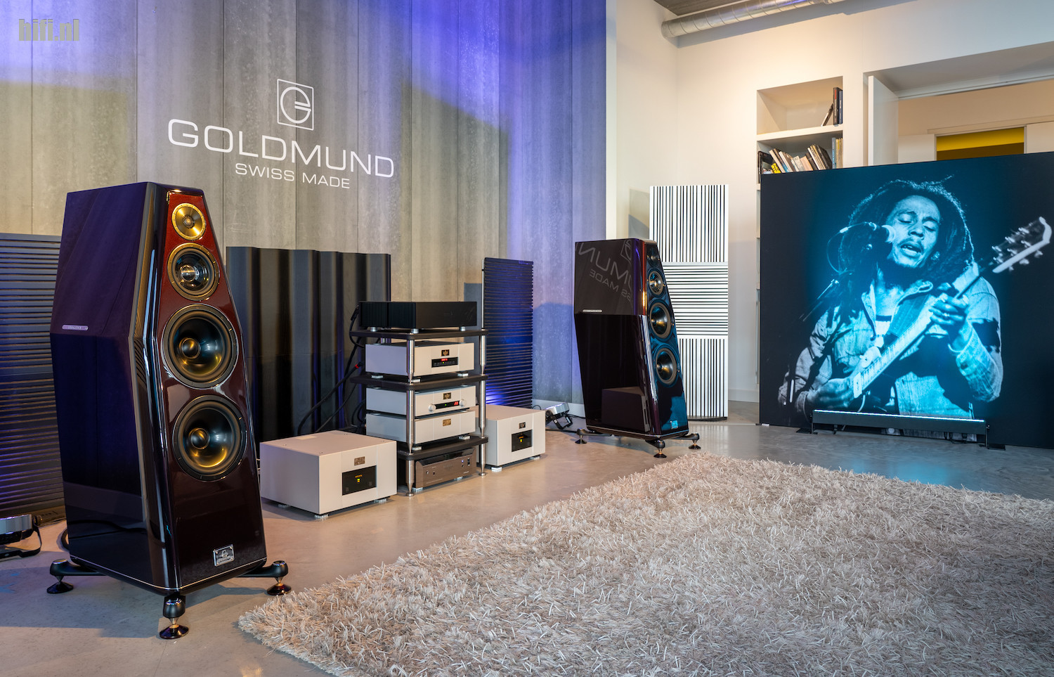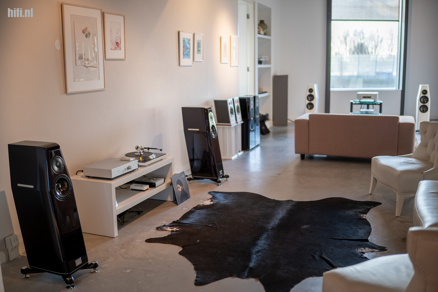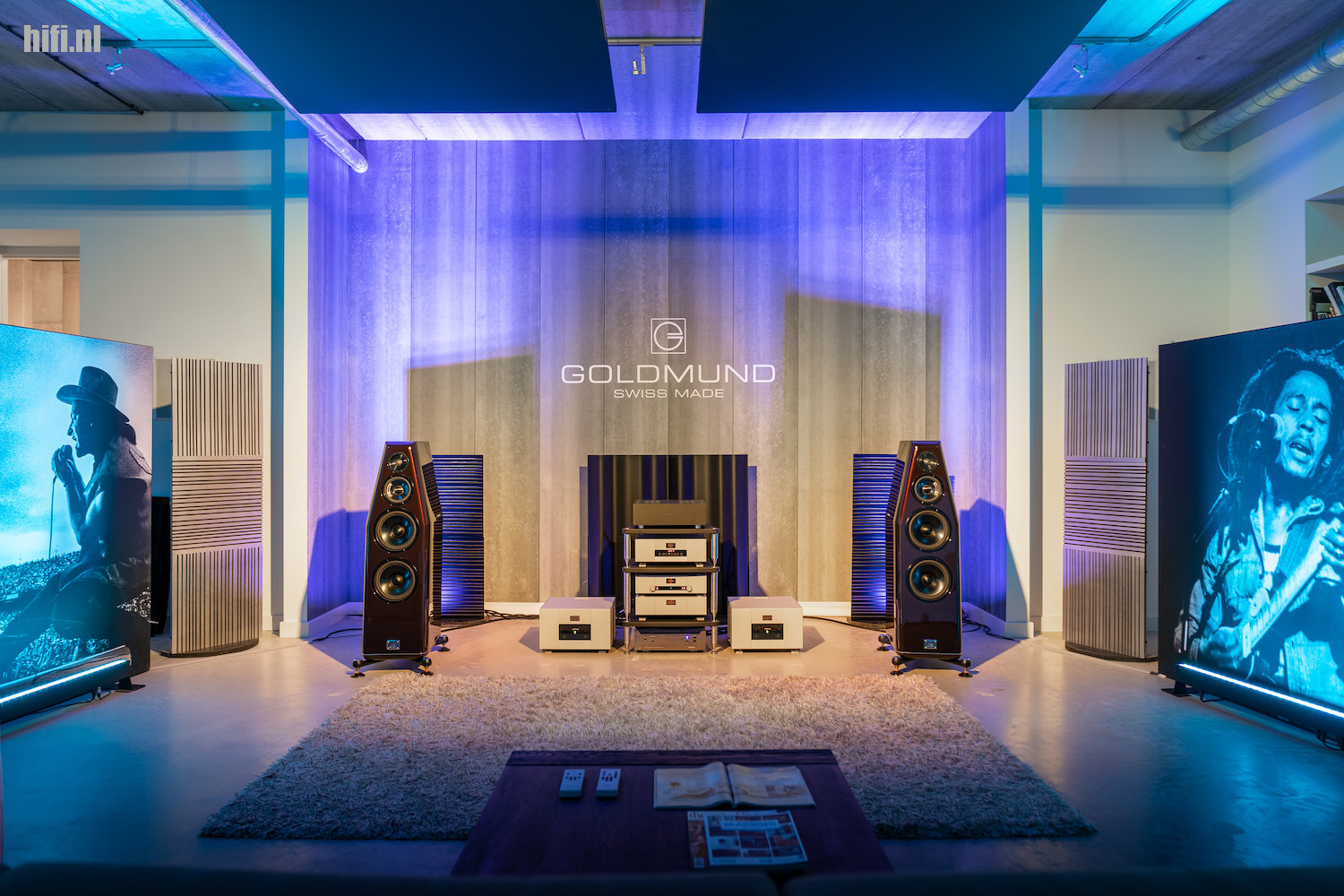 Nog meer XLR Ikigai Kangai interlinks gaan naar de links en rechts opgestelde Goldmund Telos 1000 NextGen mono eindversterkers. Goldmund heeft gelijk met hun stelling dat des te krachtiger de eindversterker is, des te beter zal de controle zijn over de luidspreker. Waarbij power niet de enige belangrijke parameter is, maar natuurlijk meer zaken zoals stabiliteit van de voeding, een groot frequentiebereik, lage vervorming en lage eigen ruis. Het door Goldmund ontwikkelde Leonardo onderzoeksprogramma vormt de basis voor elk Goldmund onderdeel, de DAC, de voorversterker en de Telos 1000 mono eindversterkers. De Telos 1000 maakt intern gebruik van een fysiek gescheiden stuur- en eindversterker om negatieve beïnvloeding van de circuits onderling te voorkomen. De zeer lage uitgangsimpedantie van de eindtrap houdt de woofers in elke luidspreker volledig onder controle tot aan de laagste frequenties. Geen vervormde en/of ongedefinieerde bas, wel behoud van de kleinste details. Elk Telos 1000 blok levert een vermogen van 365 Watt aan 8 Ohm. Om aan te geven hoe ruim de voeding is bemeten van elke Telos 1000, het gewicht per mono eindversterker is 60 kilo! Met het passeren van de Goldmund onderdelen verklap ik vast de prijzen, de Mimesis 20H NextGen DAC heeft een prijs van 85.000 euro, de Mimesis 37S NextGen voorversterker kost 30.000 euro en de Telos 1000 eindtrap is 68.500 euro per stuk.