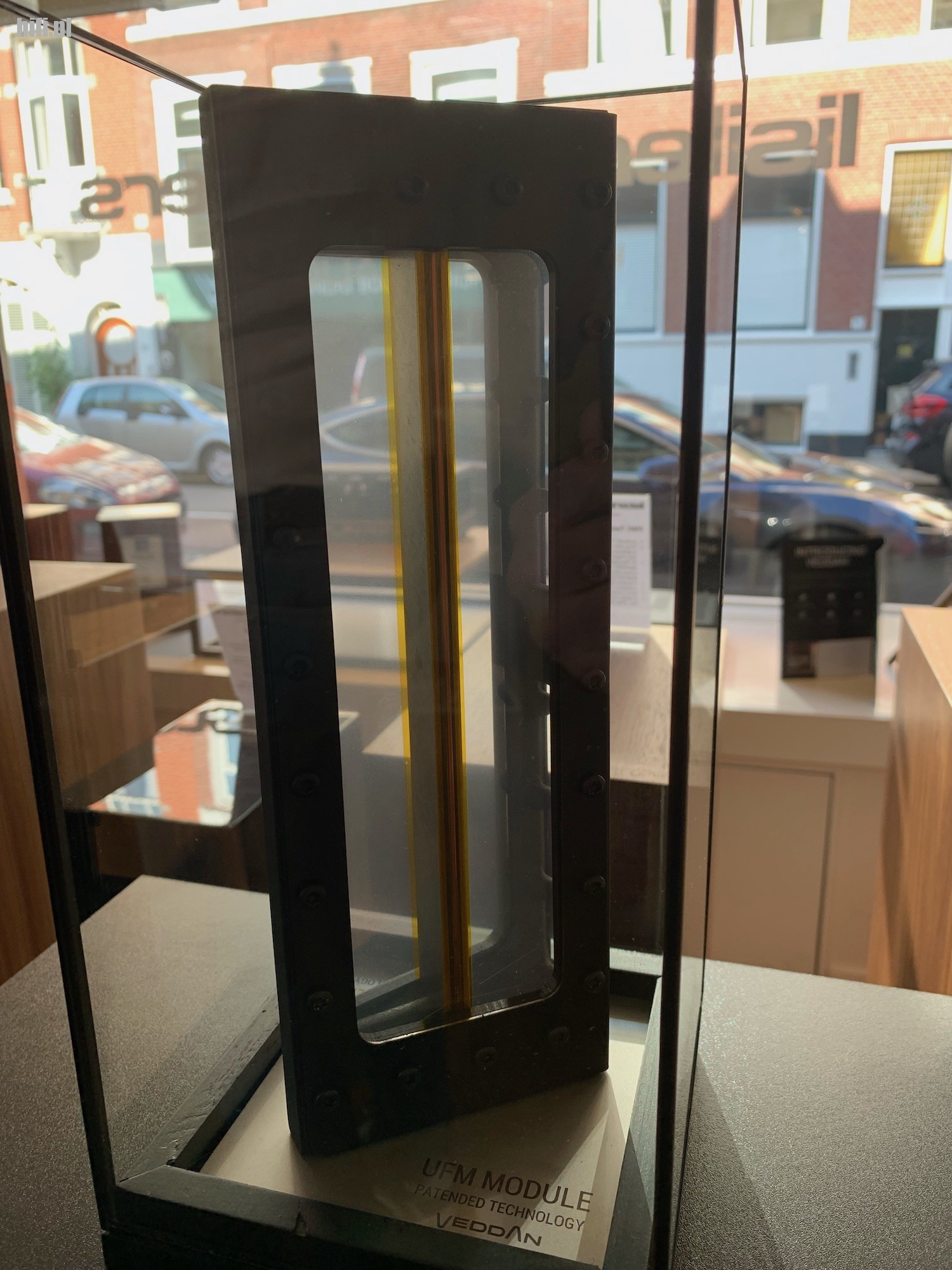 Kort een uittreksel uit ons verslag van vorig jaar over de Veddan luidsprekers. De Veddan Origin is ontsproten aan het brein van André Kamperman, en in samenwerking met de Achterhoekse onderneming IF-Adamas BV verder ontwikkeld tot een compleet systeem. De Veddan Origin maakt voor de midden en hoge tonen gebruik van Veddan Sound Modules. In een metalen, driehoekig frame met de vorm van een hoge taartpunt wordt een magneetstrip star bevestigd om links en rechts daarvan gespannen membranen, met slechts de dikte van een halve mensenhaar, naar binnen en buiten te laten bewegen. De beweging zet elektrische energie om in geluid zonder dat er een fase verschuiving zal optreden over de frequentieband.