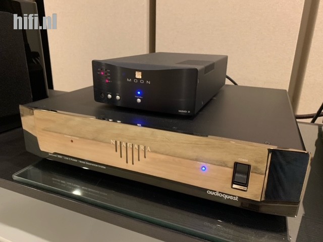 In de grote luisterruimte van ongeveer 6 meter bij 5 meter kan ik plaatsnemen op een comfortabele bank, op ongeveer 4 meter afstand van de luidsprekers die ruim 3 meter uit elkaar opgesteld staan. Voor de GoldenEar Technology Triton One.R spelen we met een Moon Mind 2 steamer als Roon Endpoint, digitaal gekoppeld aan een Classé Delta Pre processor/voorversterker en een Classé Delta Stereo eindversterker. Alles gevoed uit een AudioQuest Niagara 3000 netfilter (foto rechts) door middel van AudioQuest NRG Z en Y netsnoeren.