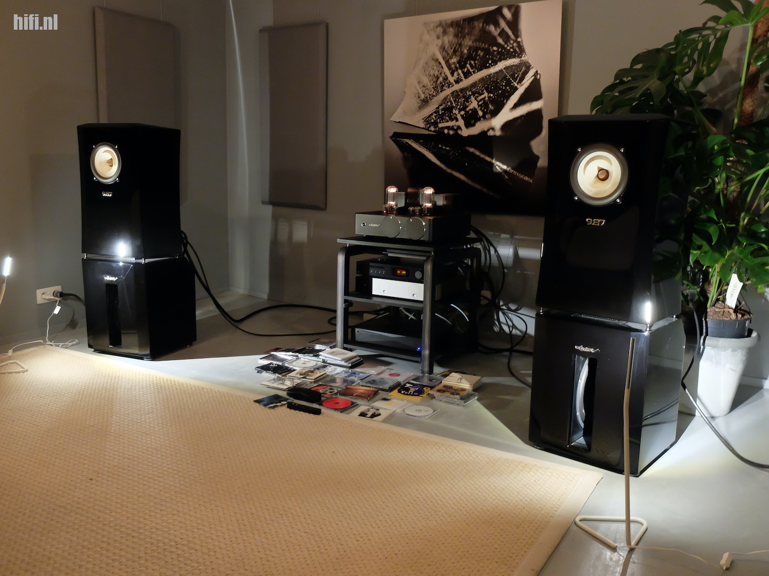 Natuurlijk was er tijdens de Berlijnse avond ook tijd voor muziek. We luisterden naar een Voxativ T805 Integrated Amp met Voxativ 9.87 luidsprekersysteem. Dit modulaire hybride actieve systeem bestaat uit twee units die aan elkaar zijn gekoppeld om als één geheel te presteren. Het bovenste gedeelte bestaat uit een passieve Pi-monitor van de tweede generatie die uitgerust kan worden met een driver naar keuze. Het onderste gedeelte van de combinatie bestaat uit het krachtige actieve Pi-Bass woofer-uitbreidingssysteem dat Ripol®-luidsprekerontwerpfilosofie combineert met het door Voxativ Audio gepatenteerde Acoustic Stealth Technology®. De Pi-Bass module is uitgerust met 2 extreem snelle neodymium woofers die aangedreven worden door een 250W klasse A/B versterker. Gezien deze unieke combinatie werkt het systeem semi-actief. In die zin dat de Pi-monitoren geen crossover nodig hebben omdat ze rechtstreeks gevoed worden door een complementaire versterker zoals de Voxativ T805.
