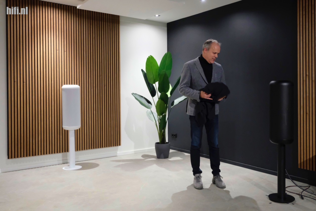 Nadat we in de ‘kraamruimte’ van Veddan eerste kennis hebben gemaakt met de interne organen van de Atom, begeven we ons naar de stijlvol ingerichte luisterruimte. Tijdens het officiële moment van onthulling krijgen we een goed beeld van de nieuwe Veddan Atom en kunnen deze nieuwe telg als geslaagde aanvulling op de luidsprekerlijn betitelen. Deze Atom maakt op ons de indruk van een soort van Mini-Origin. Nou ja, met een diameter van 25,5 en een hoogte van 69 centimeter (zonder voet) is dit niet écht mini. Deze nieuwe aanwinst uit de ‘skunk works’ van Veddan heeft wel een hoge schattigheidsfactor, zonder hierbij de traditionele look & feel van de originele Veddan Origin te hebben verloren.