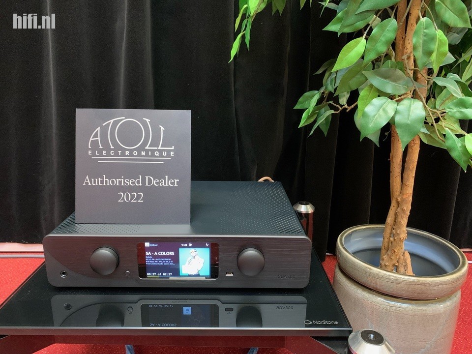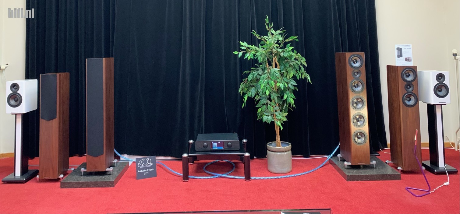 Als vroege bezoeker krijg ik de kans eerst eigen gekozen muziek te spelen op een systeem dat bestaat uit een Atoll SDA300 streamer/dac/versterker, leverbaar vanaf 30 november 2022 is het een all-in one flagship receiver uit Frankrijk. Daaraan gekoppeld via dikke Supra Sword Excaliber luidsprekers kabels zijn Acoustic Energy AE520 luidsprekers. Net als KEF en Focal heeft ook AE520 het in zich om ruimtelijk te spelen. Ik luister naar een fraaie solo viool waarin ik het spel van Anne Akiko Meyers duidelijk herken, uitgevoerd is een werk van componist Bach. De tweeter met carbon dome weet de viool “echt” te maken zonder te gaan overheersen in het hoog.