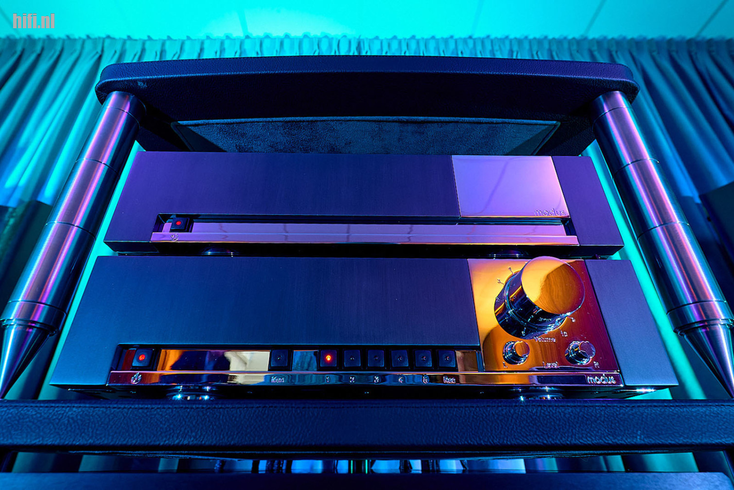 Terwijl ik een ‘wauw’ nauwelijks kan onderdrukken, word ik het volgende moment als een magneet naar het systeem achterin de ruimte getrokken. Fraaie Kharma Elegance dB-7 Signature dienen daarbij als luidsprekers. Boven op het Italiaanse Bassocontinuo Accordeon rack uit hun Reference lijn, staat een spectaculair vormgegeven Chord Dave DAC. Eén verdieping lager in het rack staan de producten waar deze twee dagen de hoofdrol voor is toebedeeld. De Modus Audio SPR01 versterker met de SPA01 eindversterker, waarover straks uiteraard meer.
