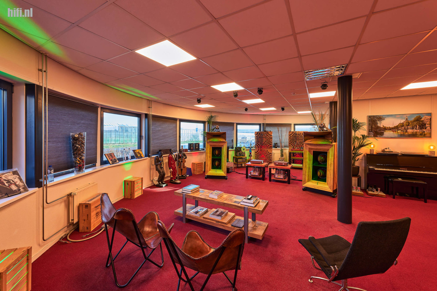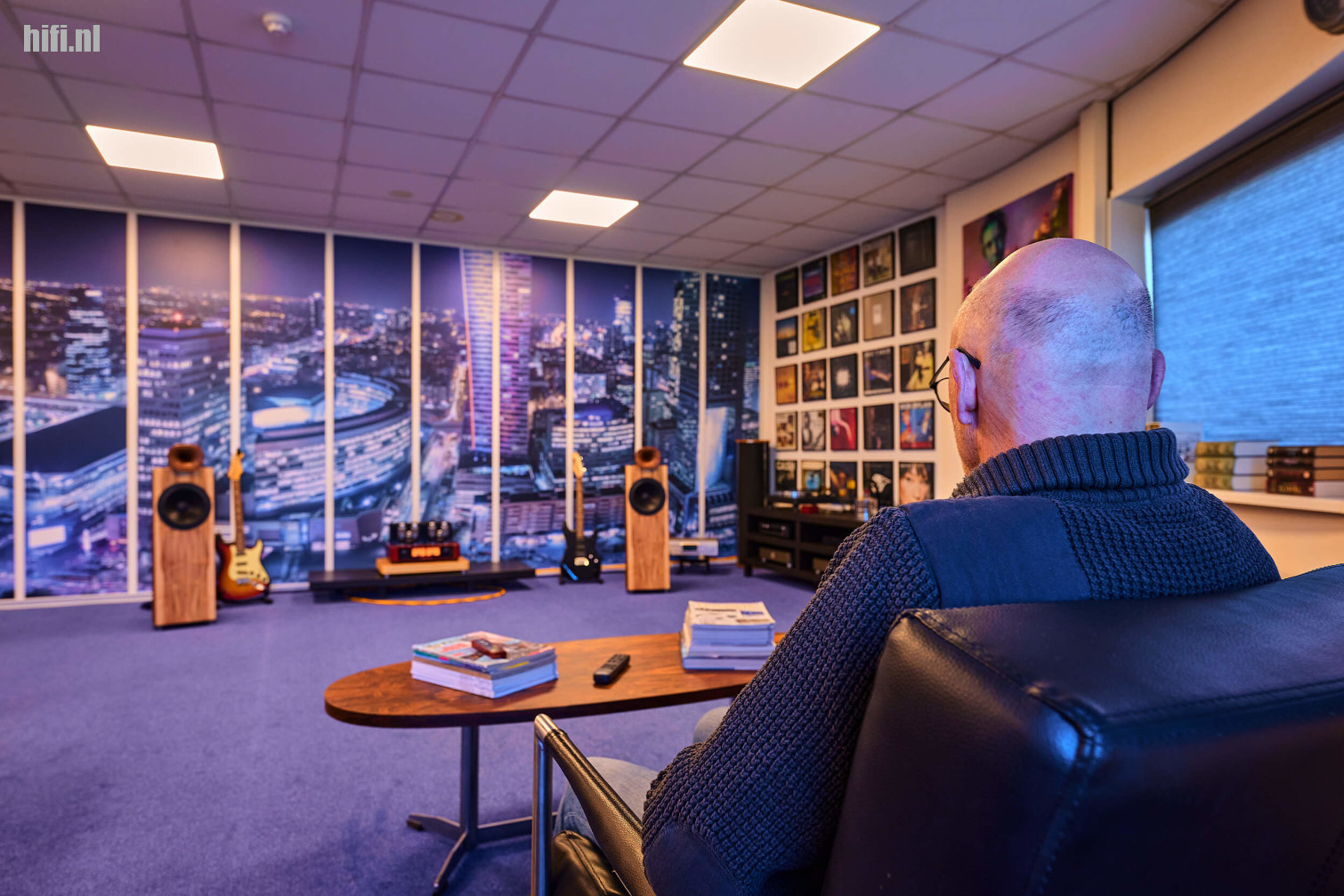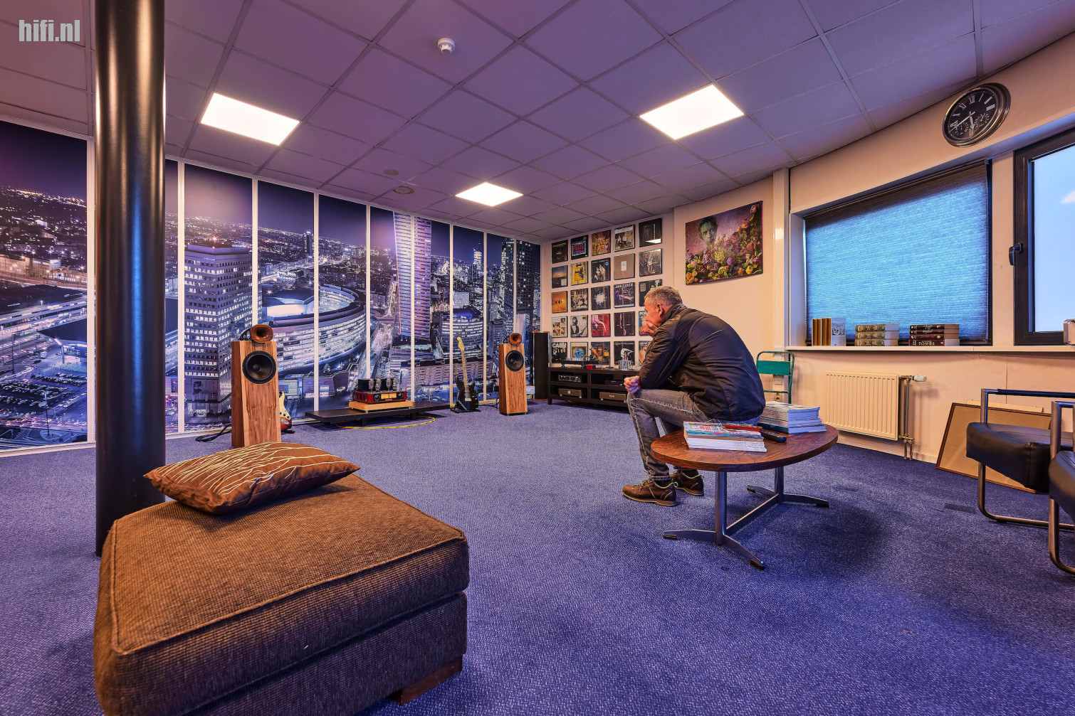 Hoewel dit vertrek op de 1e verdieping door Marco gekscherend “kleine demoruimte” wordt genoemd, is er eigenlijk niets kleins aan. Ik schat dat de ruimte iets van 7 x 8 meter is met een zowel visueel als akoestisch fraai rond weglopende pui. De luidsprekers staan mooi ruim uit elkaar en licht ingedraaid opgesteld.