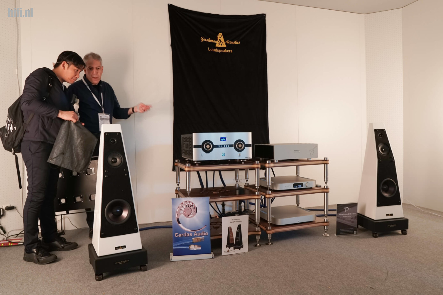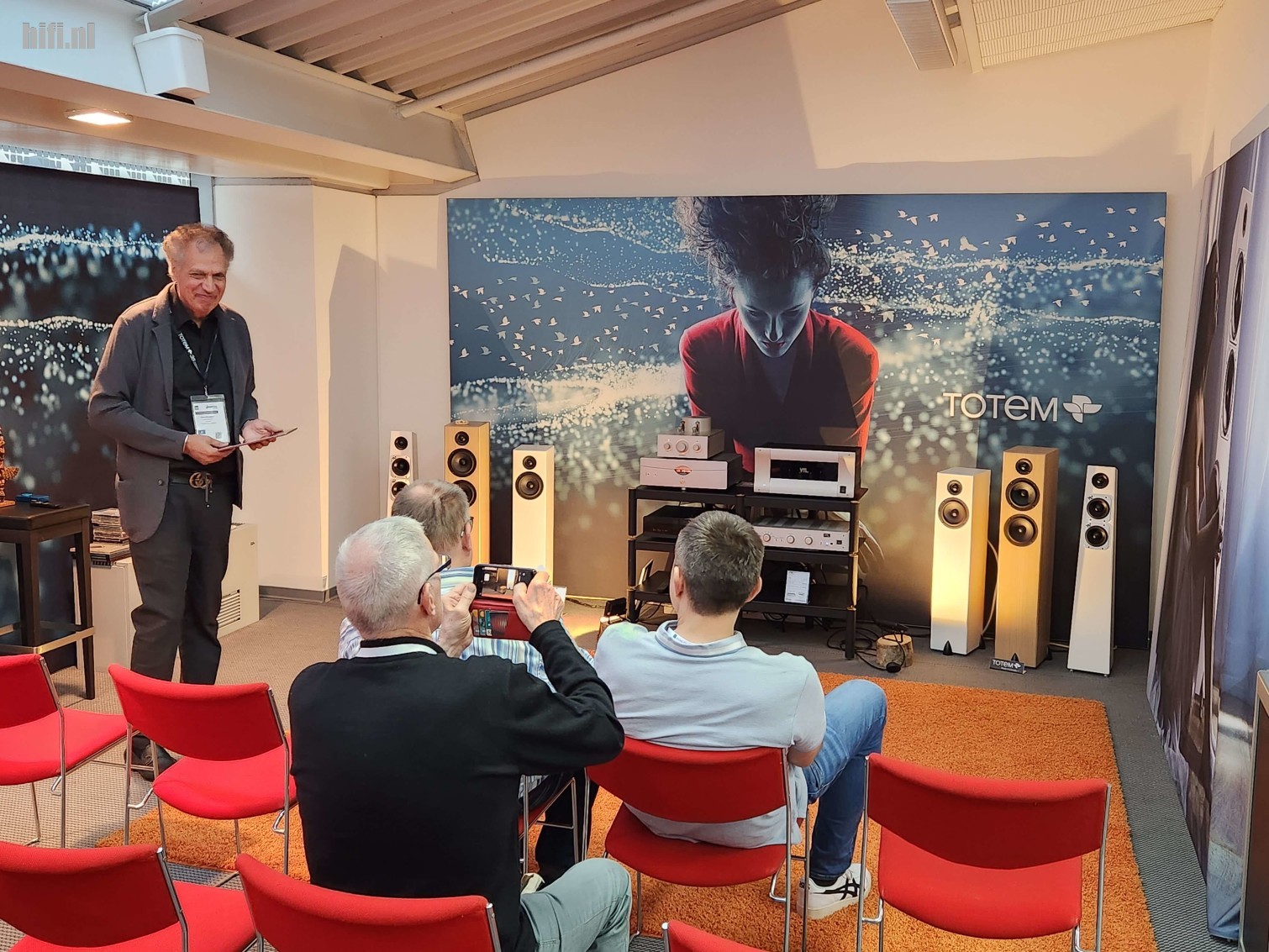 Bij Totem Acoustics moet je nooit zijn voor gigantische luidsprekers. Neen, daar doen de Canadezen zelden aan mee. Je ziet hier de immer sympathieke Vince Bruzzese uitleggen dat kleine, slanke zuilen ook kamervullend laag kunnen produceren.