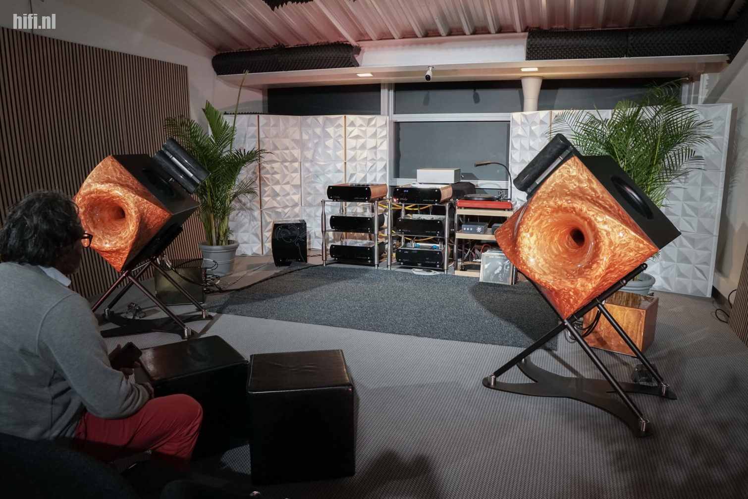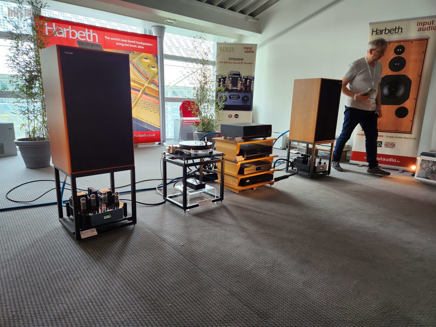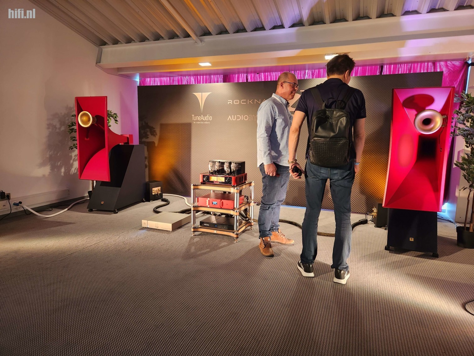 Typisch voor de meer high-end en gespecialiseerde opstellingen is dat veel knappe merken worden gehuwd tot een muzieksysteem dat heel bijzonder klinkt. Hier bijvoorbeeld Trafomatic, Rockna, Audiobyte - en natuurlijk de knalrode Avaton-hoorns van TuneAudio.