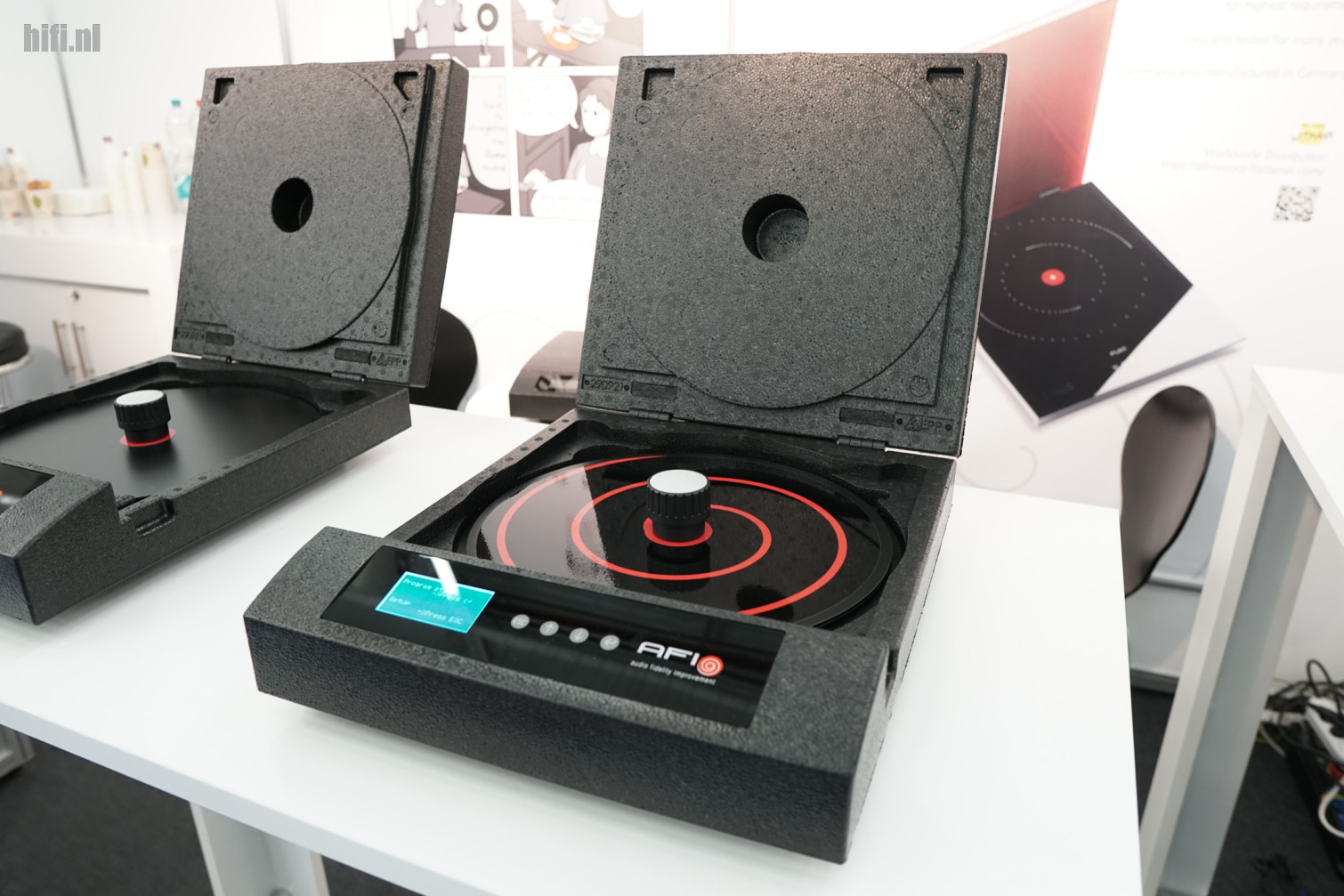 Accessoires ontdek je genoeg op de beursvloer. Onze aandacht werkt getrokken door deze twee thermische apparaten van AFI, bedoeld om warped vinyl weer recht te maken.