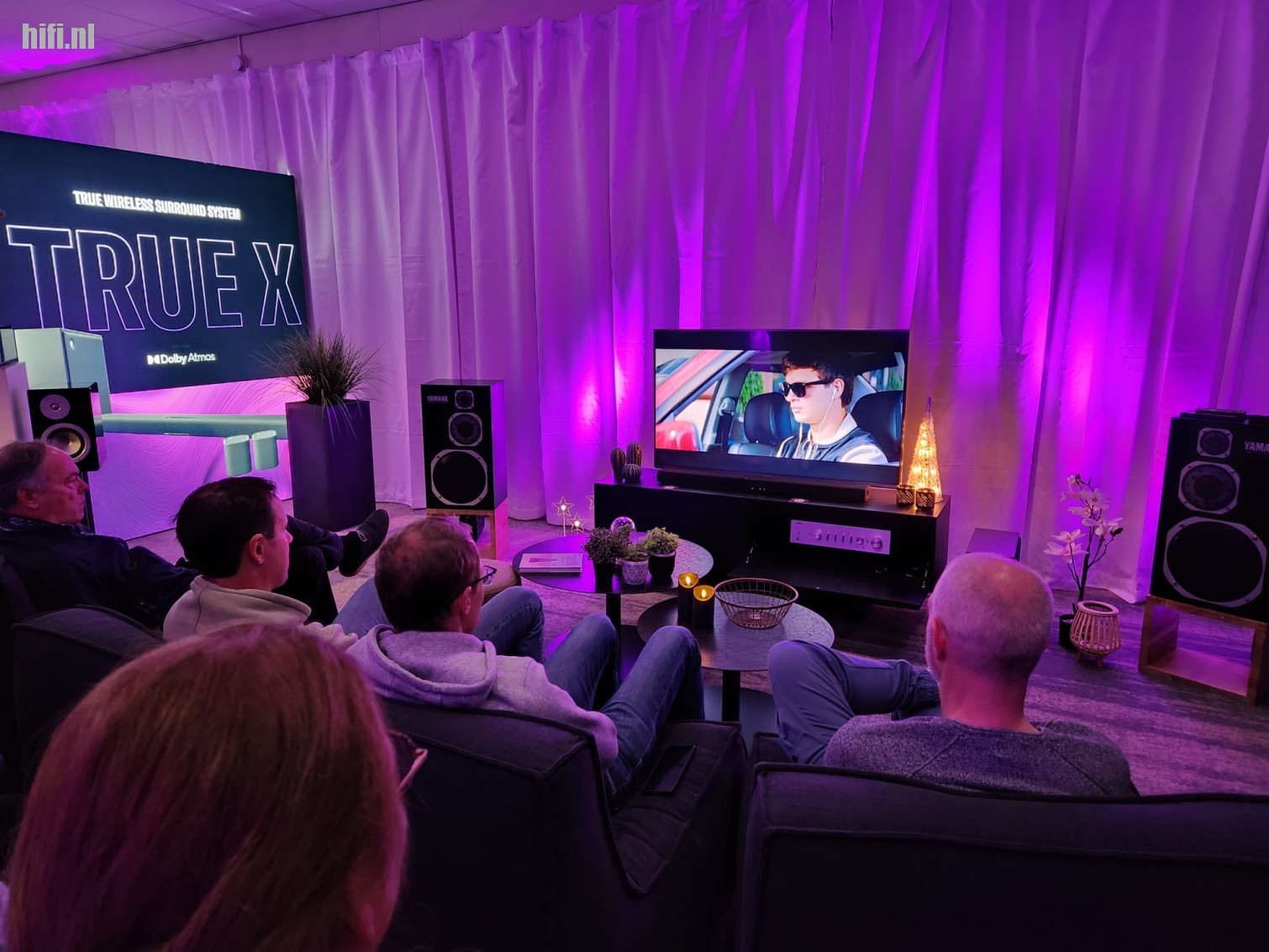 Naast de headfi-kamer met prikkelende foto's aan de muur, had Yamaha een verdieping lager heel aardig en gezellig een grote ruimte aangekleed. Toen we er binnenliepen viel ons mond boenk open. De geweldige Baby Driver-film stond net op, de scène met de bandoverval op de tonen van Bellbottoms van de Jon Spencer Blues Explosion. Kamervullend, iedereen mee... En het kwam uit een True X-soundbar met bijkomende piepkleine speakertjes.