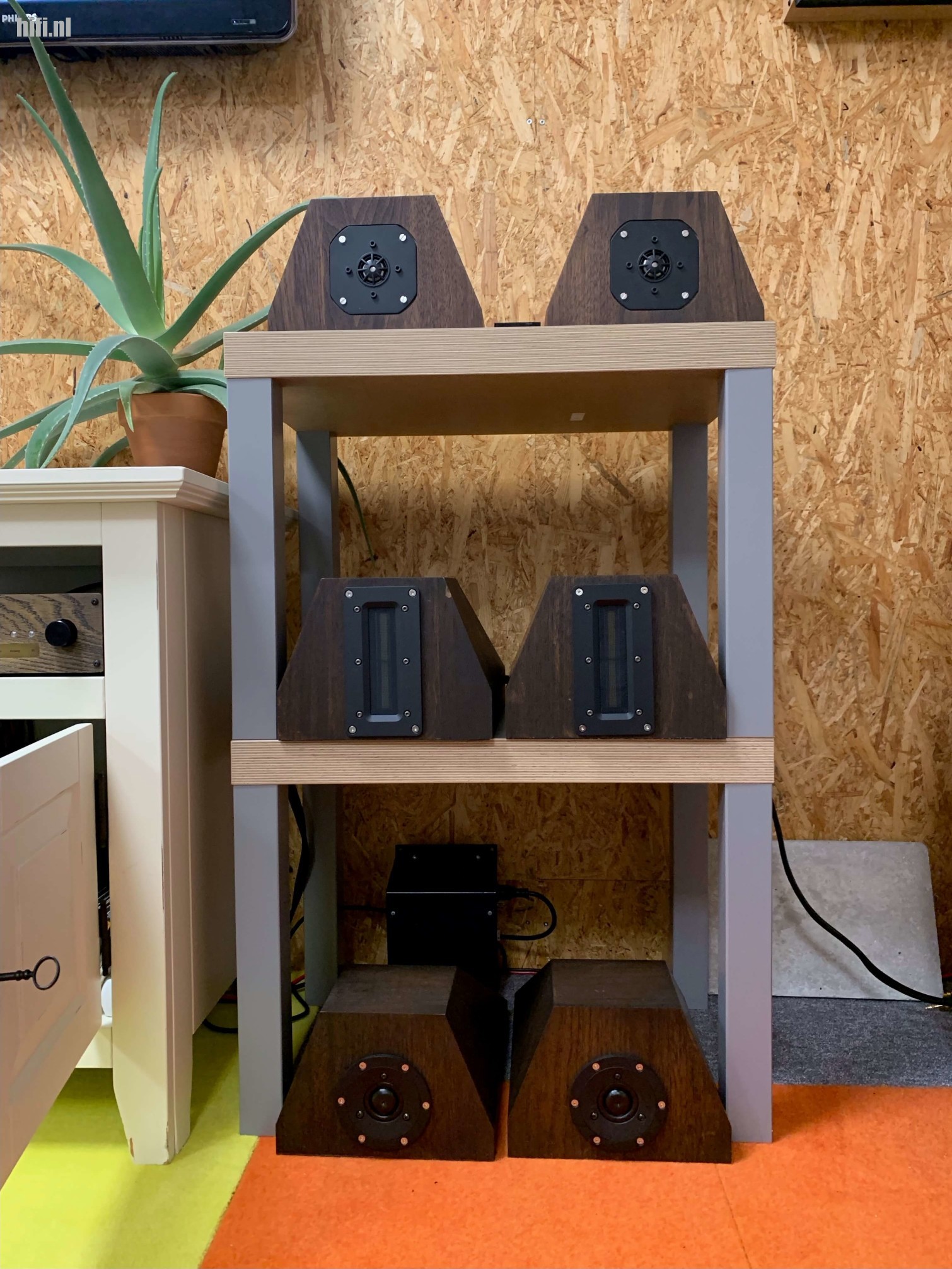 Als u komt luisteren is het vast geen probleem om uw eigen versterker mee te nemen, waar ik naar luisterde is een Naim Supernait 3 met daaraan een Naim ND 5 XS netwerkspeler. Permanent ter beschikking staat een klasse D versterker van de hand van Vintage Audio Repair uit Dordrecht. De luidsprekers staan in een opgeruimde luisterplek, onderdeel vormend van links het kantoor van Hans en rechts de plek waar de filters worden gemaakt, waar de 3D-printers staan en waar de meetapparatuur staat opgesteld.