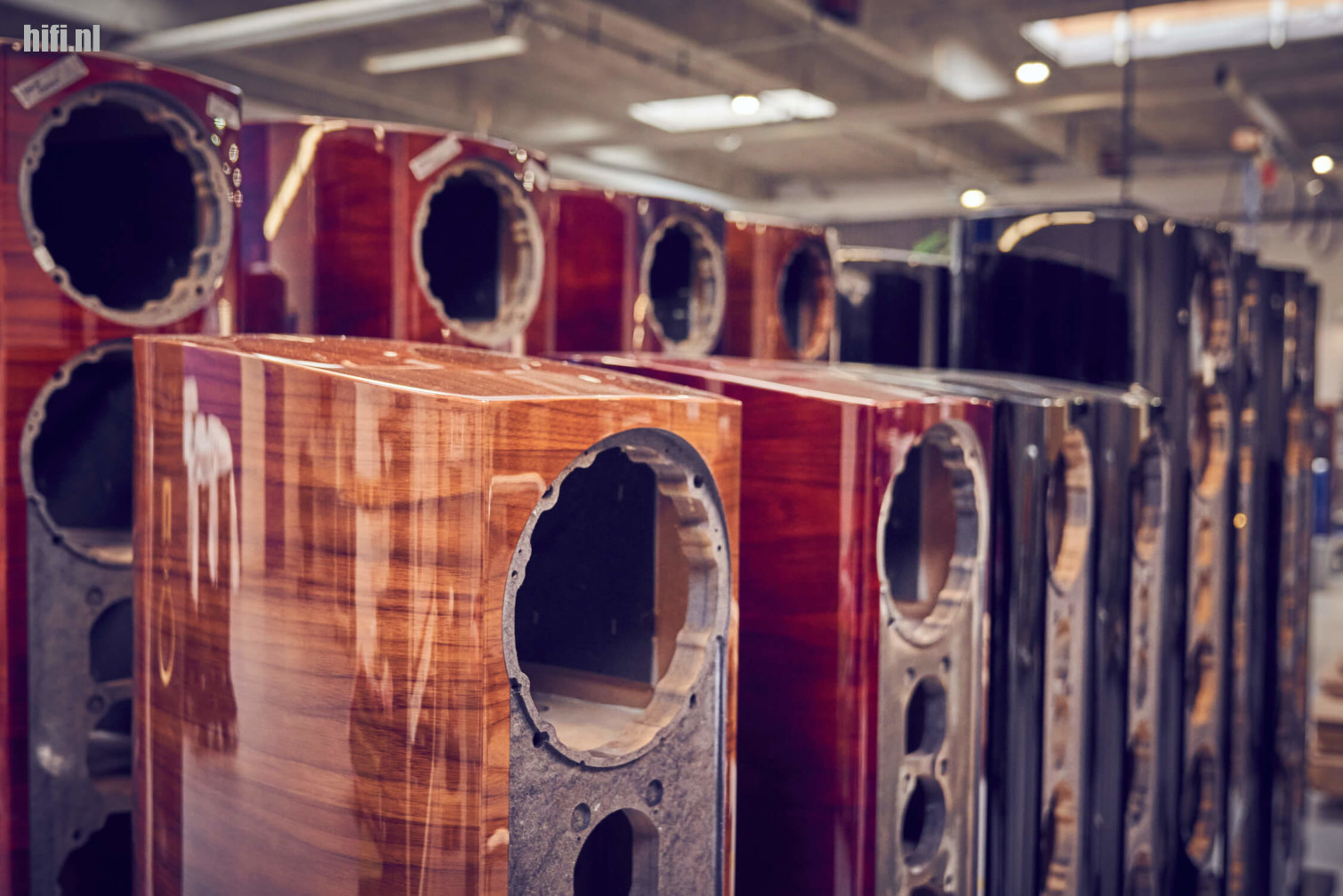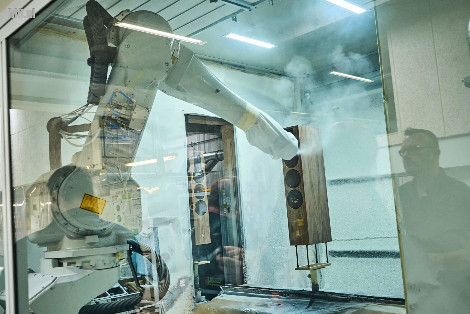 De investeringen op vlak van productie zijn heel zichtbaar tijdens de tour die we krijgen doorheen de fabriek. Vergeleken met het vorige bezoek zijn er veel machines bijgekomen om kasten vorm te geven en is er een grote gerobotiseerde spuitinstallatie geplaatst om lakken en vernis aan te brengen. Door een grote raam zien we de robotarm in actie en snappen meteen hoe die fraaie Maroon-afwerking op de Rubikore er zo egaal en weelderig kan uitzien.