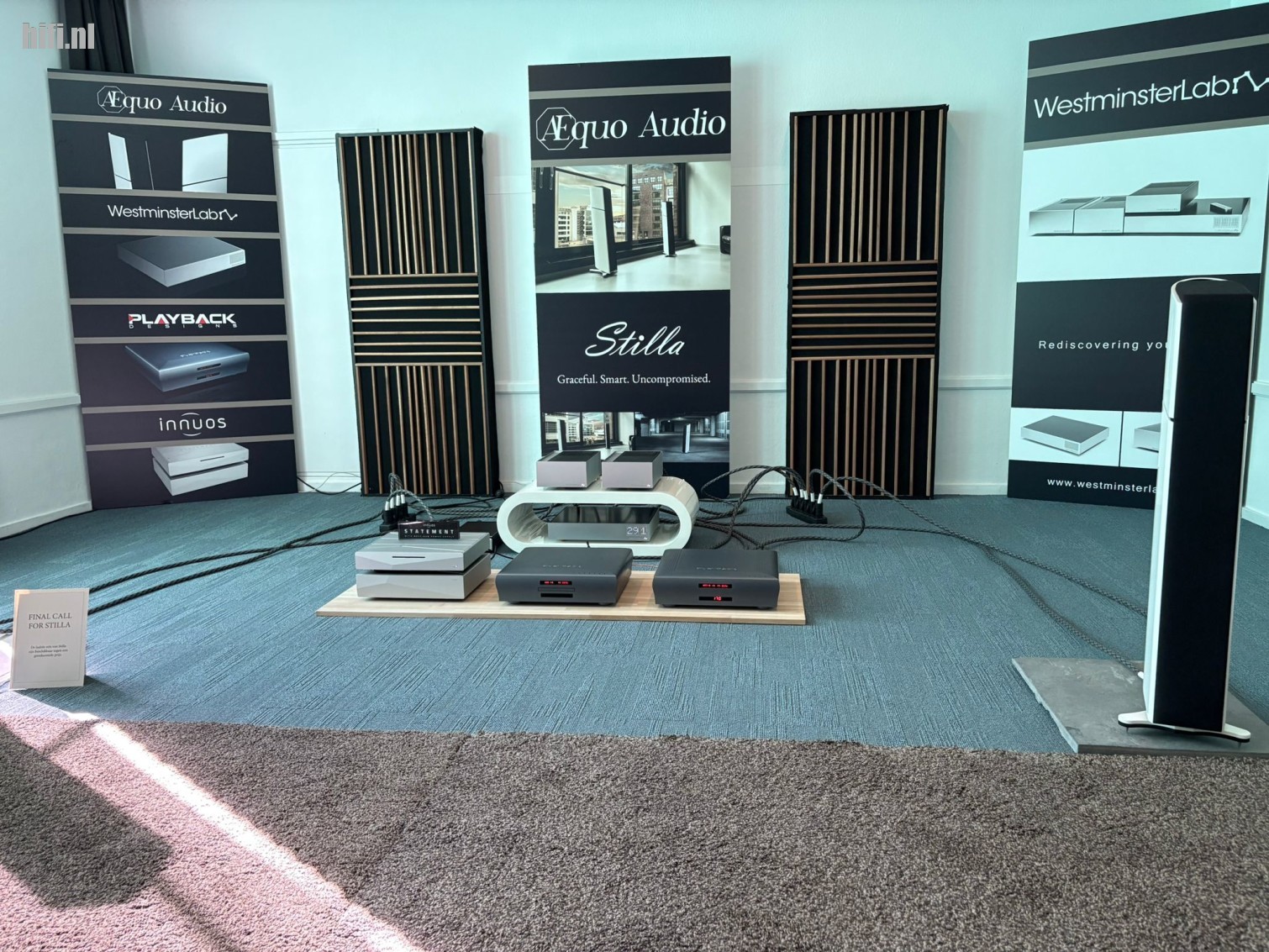 Ook zonder de nieuwe modellen van het merk ziet de kamer er weer geweldig uit, en staat er een prachtig paar Aequo Audio Stilla luidsprekers te spelen. Deze prachtige speakers staan aan weerszijde opgesteld, met in het midden diverse merken waar we ook wel warm van worden; WestminsterLab, Innuos en Playback Designs.