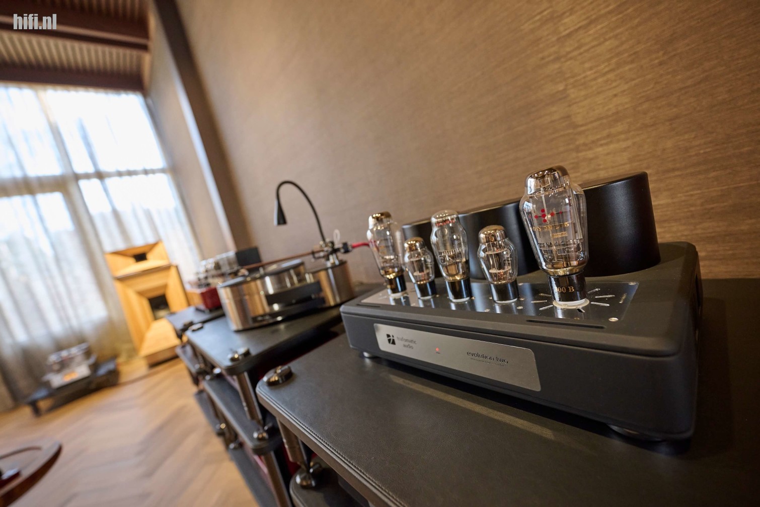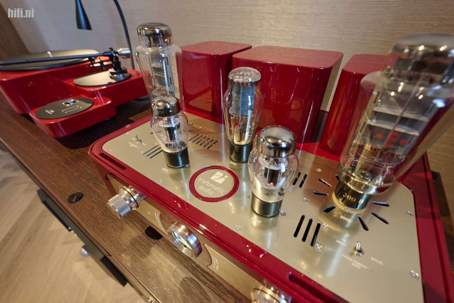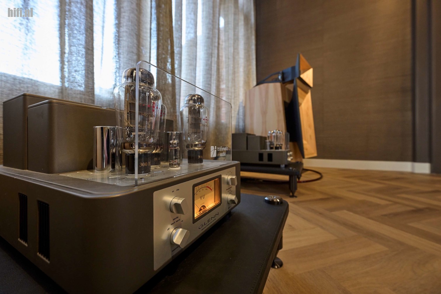 Het systeem is met zijn 133 cm hoogte niet klein, maar heeft wel relatief modale afmetingen en kan ook prettig dicht voor de achterwand worden geplaatst. Ook fijn is dat deze luidspreker in zowel kleine, middelgrote als zelfs grote ruimtes kan worden opgesteld. Het rendement ten slotte is met 95dB/1m bijzonder hoog, waardoor er al met versterkers vanaf 2 x 10 watt kan worden gespeeld. In dit geval heeft Jan voor een fraaie Trafomatic Experience Two Mk II gekozen, een geïntegreerde versterker op basis van de befaamde 300B eindbuis. De bron is bij deze demo een Reed Muse 3A, de phonotrap is een Trafomatic Phono One.