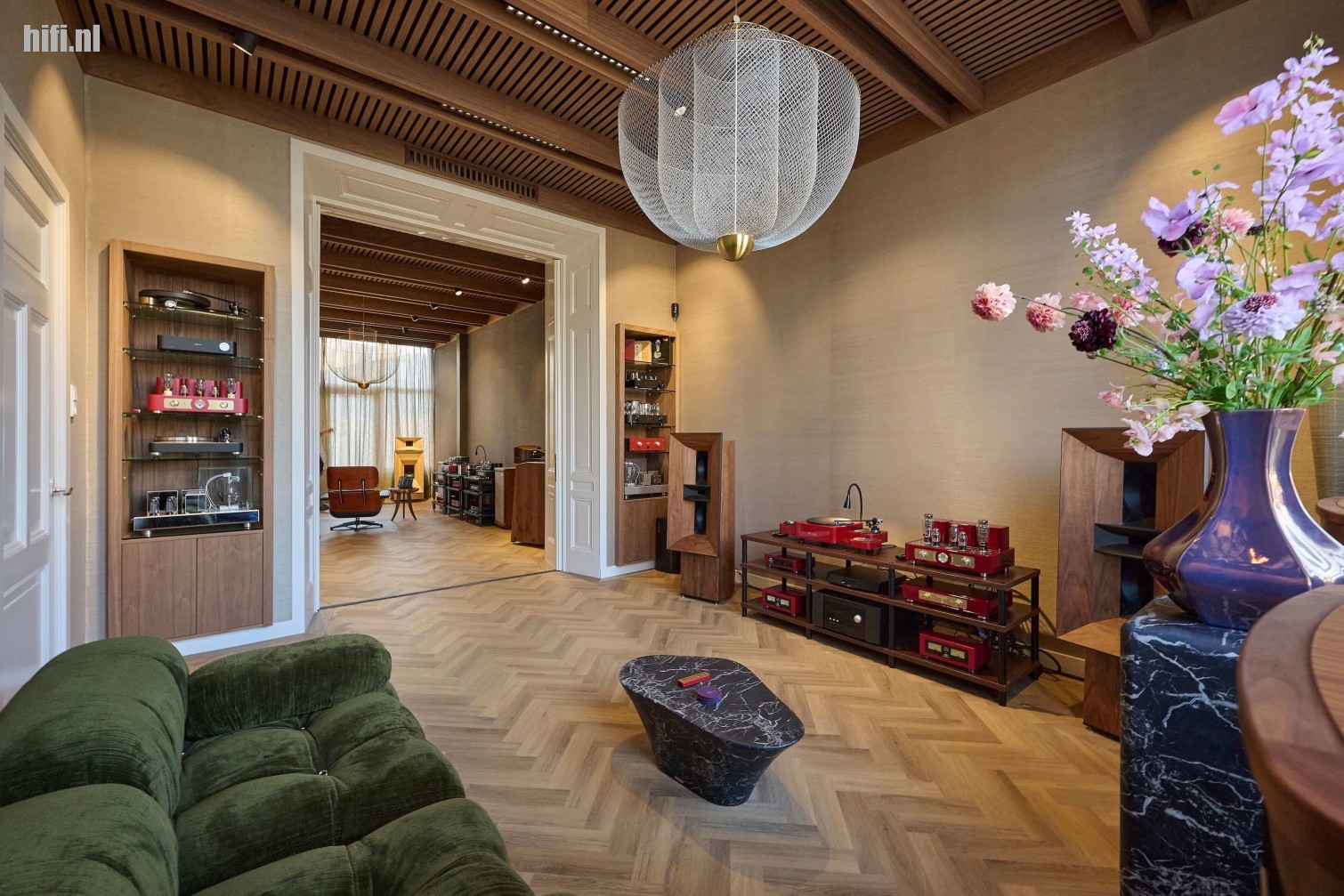 "Hier in mijn winkel EVA Acoustic ben ik “all the way” gegaan. Dus zorgen voor een verantwoorde akoestiek waarbij je zowel bij een gesprek als muziekluisteren zo prettig mogelijk voelt, maar de genomen maatregelen vervolgens nergens waarneemt.” Eigenlijk is de zo op het oog “ontspannen” inrichting waarbij niets krampachtig staat opgesteld, veel preciezer geplaatst dan je zou denken.
