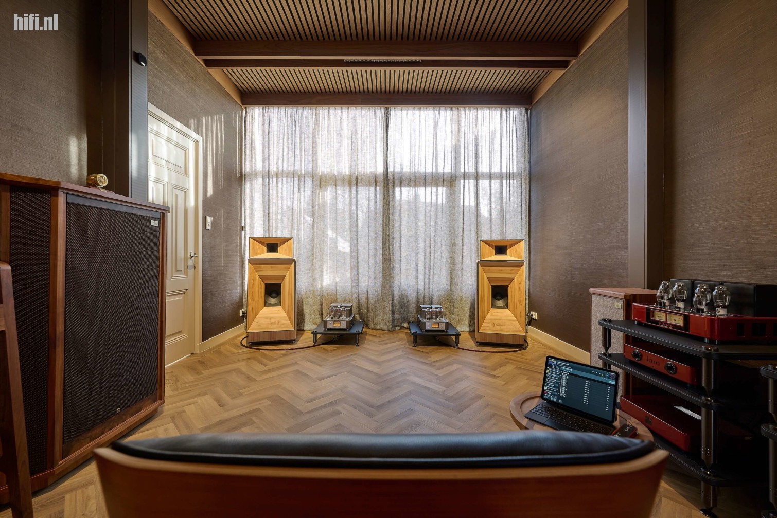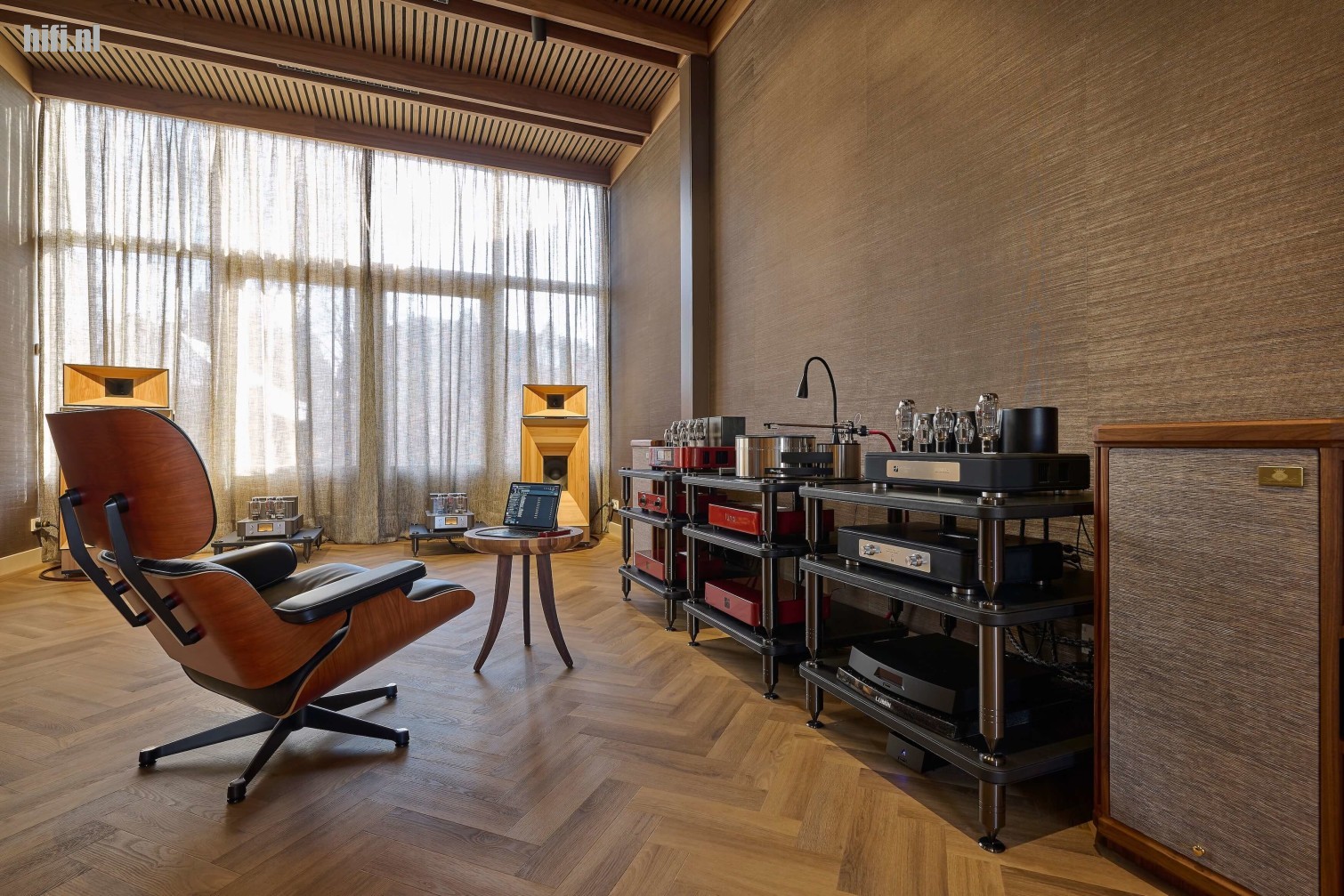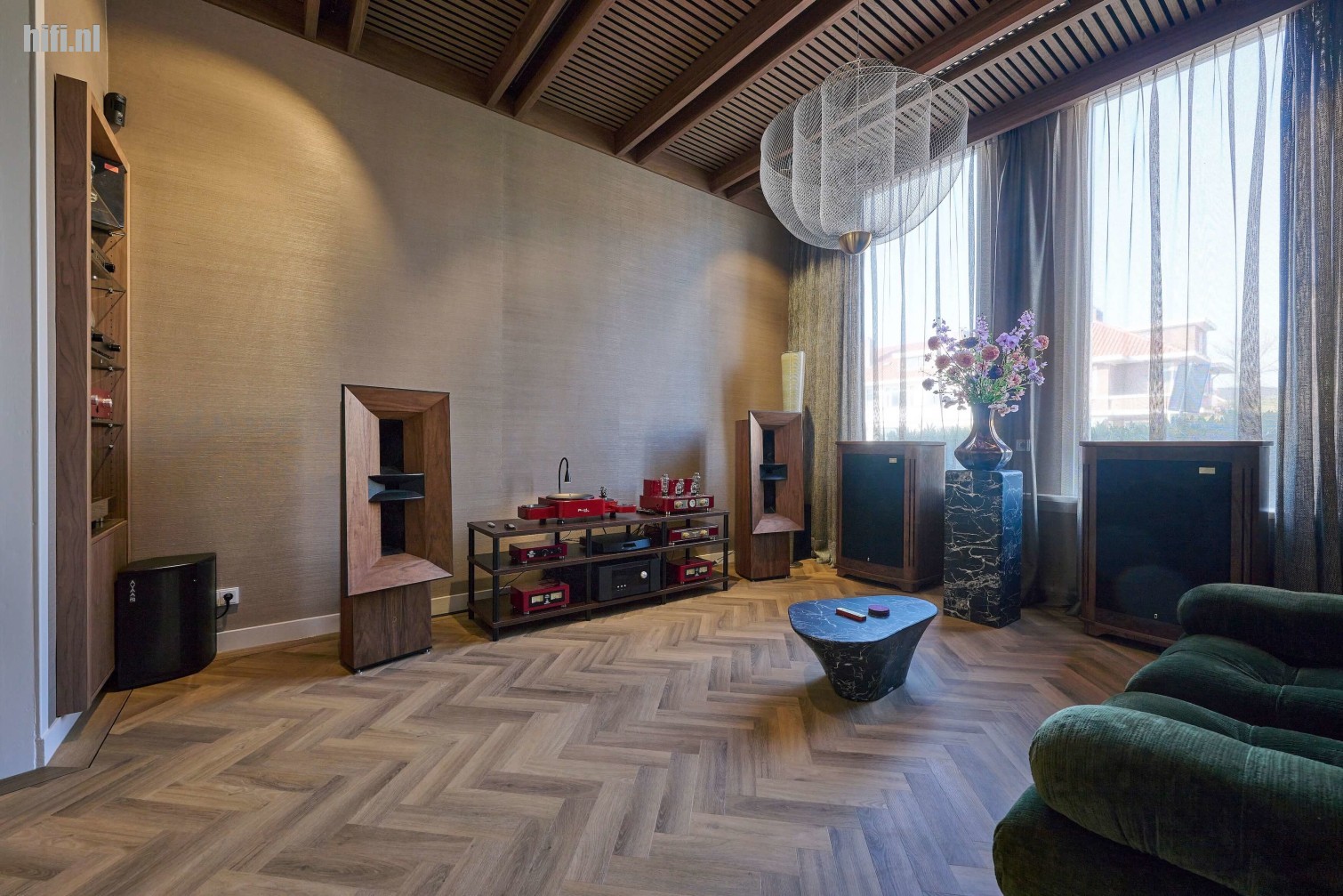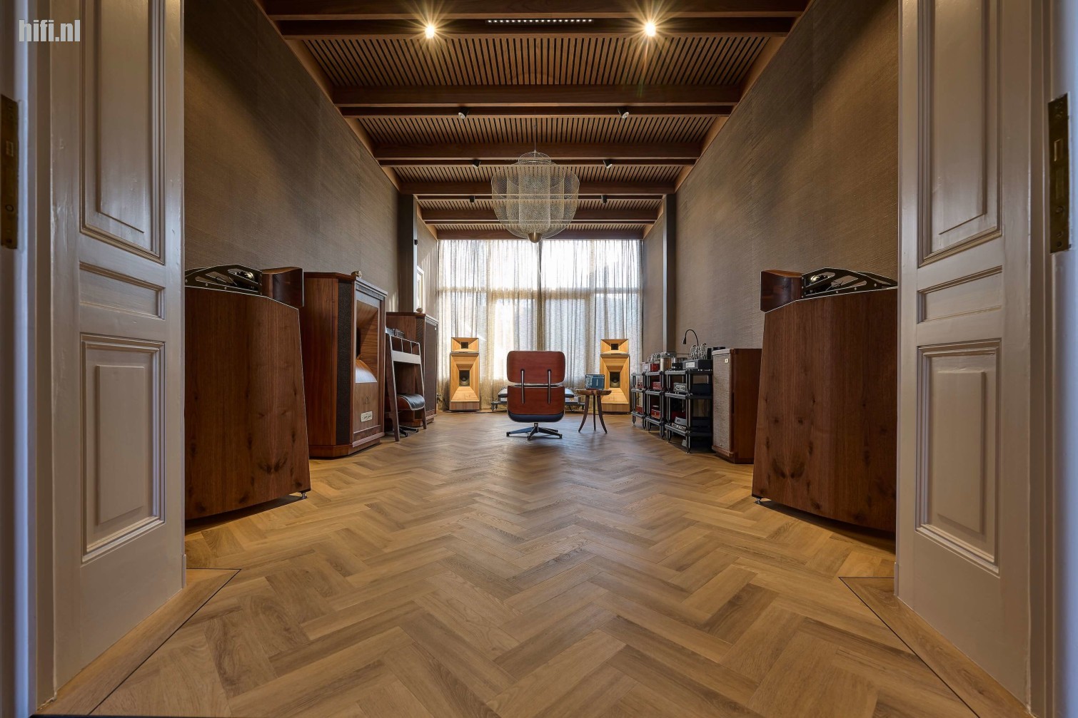 De echte eyecatcher blijkt buiten de aanwezige audiocomponenten, het door Jan zelf ontworpen en met veel vakmanschap aangebrachte vakwerkplafond te zijn. In tegenstelling tot het pand is het plafond wel hagelnieuw en ondanks het super strakke en moderne ontwerp, vormt het één geheel met de ruimte. Binnen het in een mooie warme houttint uitgevoerde raamwerk zitten trouwens veel vernuftige zaken aangebracht. Zo is de kleurechte en uiteraard volledig dimbare ledverlichting erg fraai geïmplementeerd.