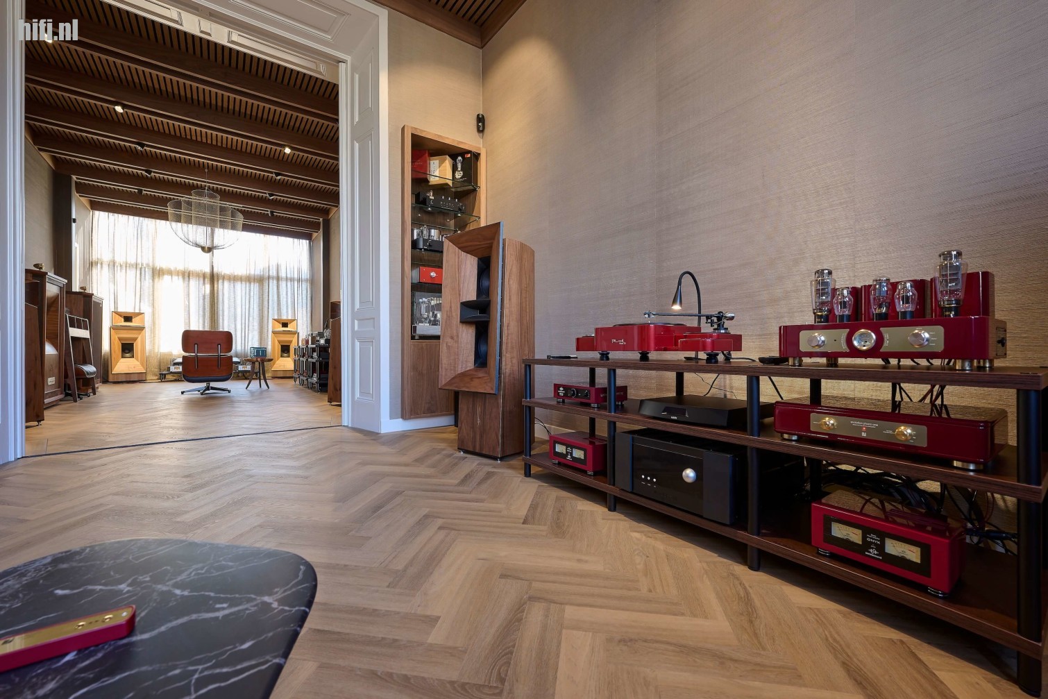 Het laatste systeem kom ik pal voor de pui die op de tuin uitkijkt tegen. Luidsprekers zijn hier Blumenhofer’s Gran Gioia MK IV’s en die mag u mee naar huis nemen voor 49.999 euro per paar. Qua versterking heeft Jan voor de Trafomatic Lara voorversterker in samenwerking met een paar Trafomatic Glenn 300B mono eindversterkers gekozen. Een prachtige set die ik al op menig show de sterren van de hemel heb horen spelen. Als eindbuizen wordt net als bij de eerste set weer van de Emission Labs Mesh 300B’s gebruikgemaakt. Net als bij systeem 2 wordt ook bij deze setting van de fraaie Lumin X1 streamer gebruikgemaakt, hoewel op analoog gebied ook een zeer fraaie Reed Muse 3C platenspeler met Trafomatic Luna phonoversterker klaarstaat. Ik vind het slim dat Jan de draaibare Vitra Eames fauteuil zo heeft opgesteld dat je door een draai van 180 graden naar de één en vervolgens de andere opstelling kan luisteren.