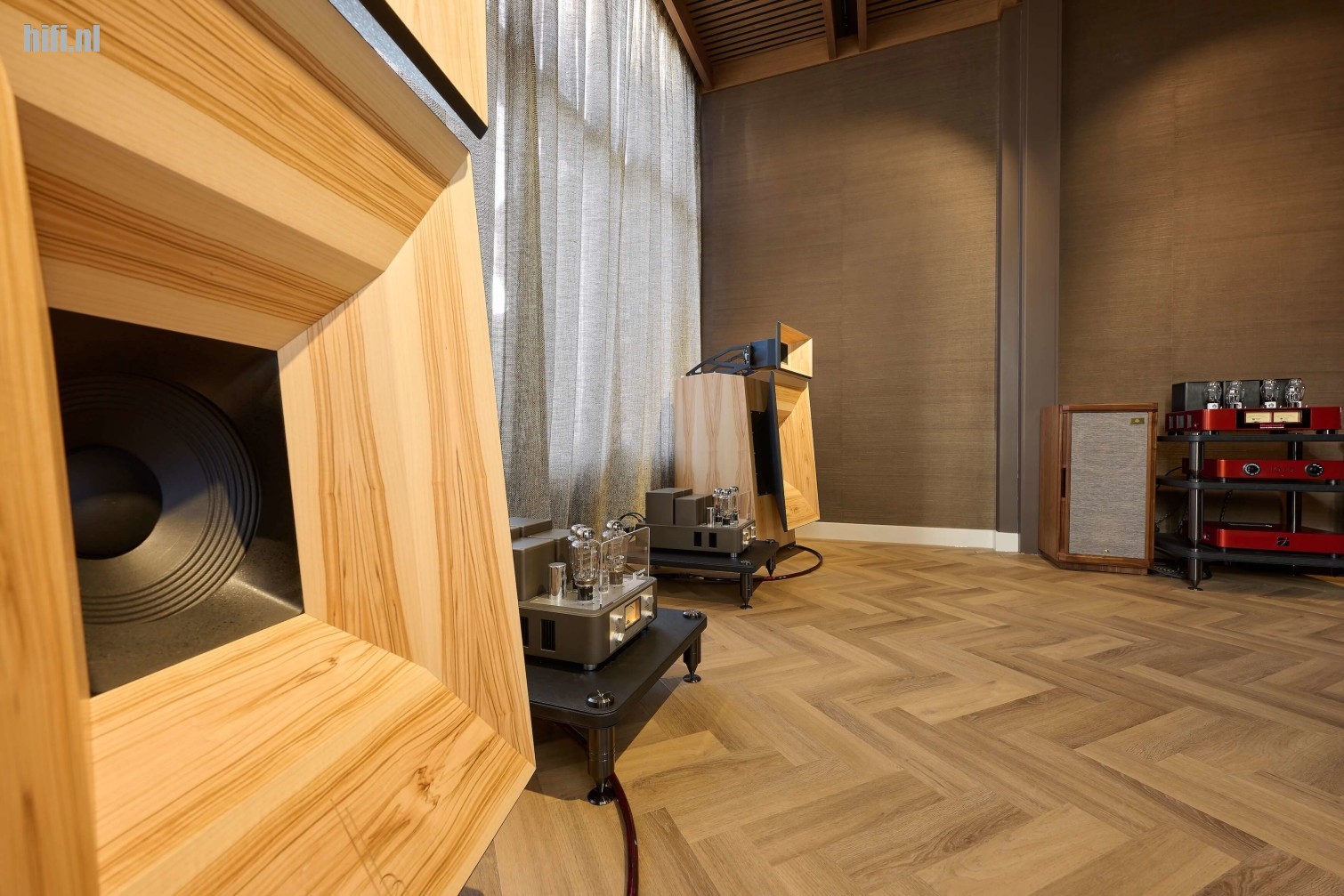 Opgesteld staan een paar Blumenhofer Gran Gioia 2x10 luidsprekers tegen de lange wand en het gaat om een weergever die in de standaard fineer uitvoering al 39.999 euro per paar kost. Dat is dus al meteen erg serieus. Het uiterlijk is typerend voor een hoornluidspreker. In dit geval zijn dat houten hoorns gevat in een conventionele hoekige vormgeving. Je houdt ervan of niet maar het geeft dit model samen met de in dit geval gekozen warme houttint, ook zijn eigen charme. In tegenstelling tot veel kleinere modellen is de Gran Gioia 2x10 een echt full range hoorn luidsprekersysteem. Dus zowel het laag, midden als hoog worden door een hoorn weergegeven.