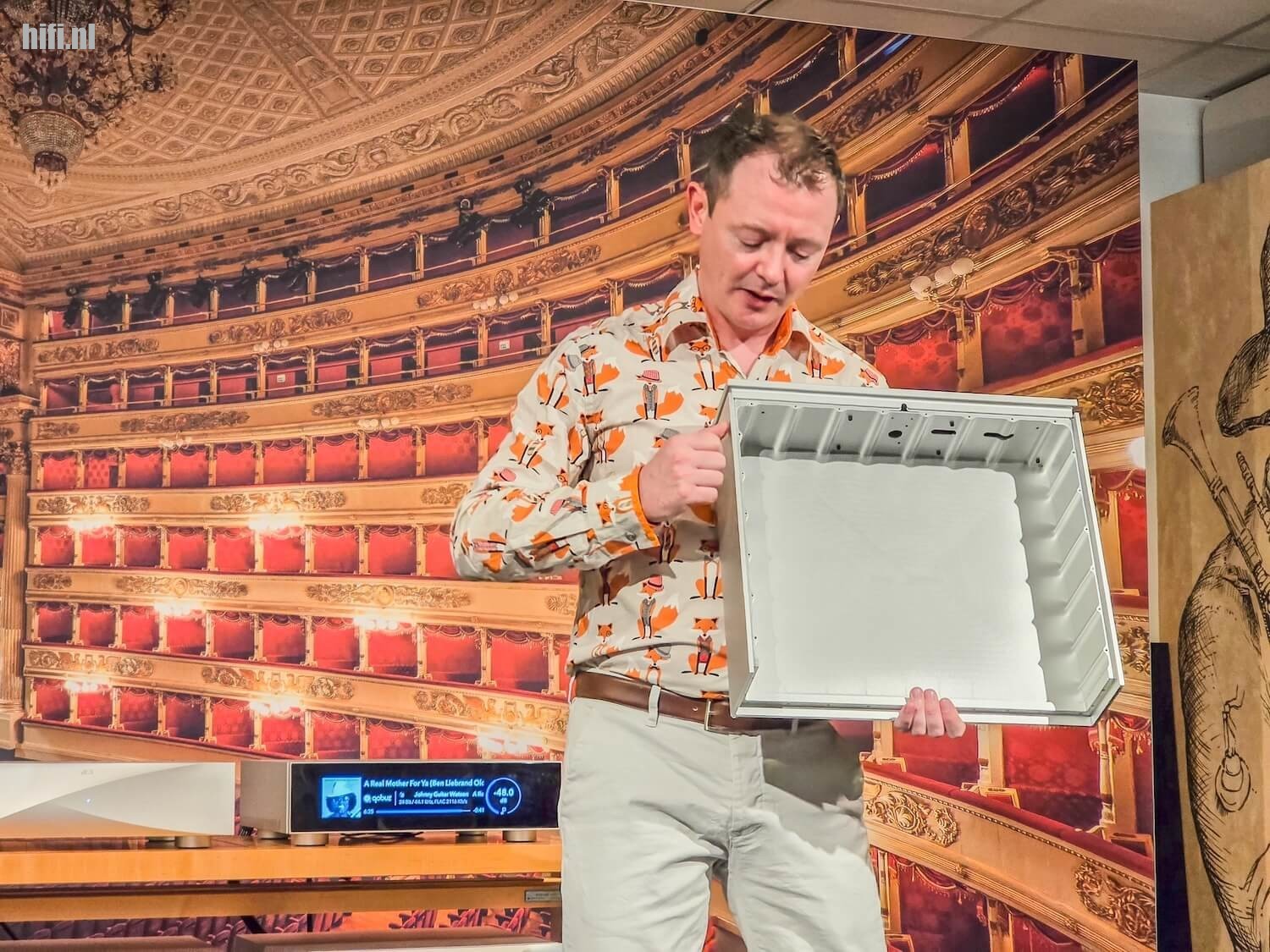 Tijdens de CNO-show werd de Varèse niet opgesteld in een toren, maar werden voor praktische redenen de Varèse-toestellen naast elkaar geplaatst. Dat deed ze niet minder chique lijken, zeker niet. Elk toestel is gefreesd uit een groot blok aluminium van 80 kg en wordt door dCS zelf geassembleerd. Het is een indrukwekkend stukje vakmanschap, dat Alasdair met zekere moeite in de lucht tilde zodat iedereen het kon bewonderen. “Als je kijkt naar hoe we onze toestellen bouwen uit één stuk, dan is de conclusie van sommigen ‘you must be mad’. Maar de allerbeste kwaliteit leveren hoort gewoon op dit prijspunt”, luidt het, wat ook de prijs. Alasdair wijst bijvoorbeeld naar de overgang van een metalen deel naar een ander paneel op het toestel dat hij gebruikt tijdens de demonstraties. Het lijkt zo goed als vlak, maar: “Dit is een prototype die we voor shows gebruiken, maar als je met je vinger er over wrijft voel je een klein randje. Dat zouden we afkeuren voor een product dat naar een klant ging.” Mij leek het eerlijk gezegd prima in orde, maar de lat ligt duidelijk hoog bij de Britten.