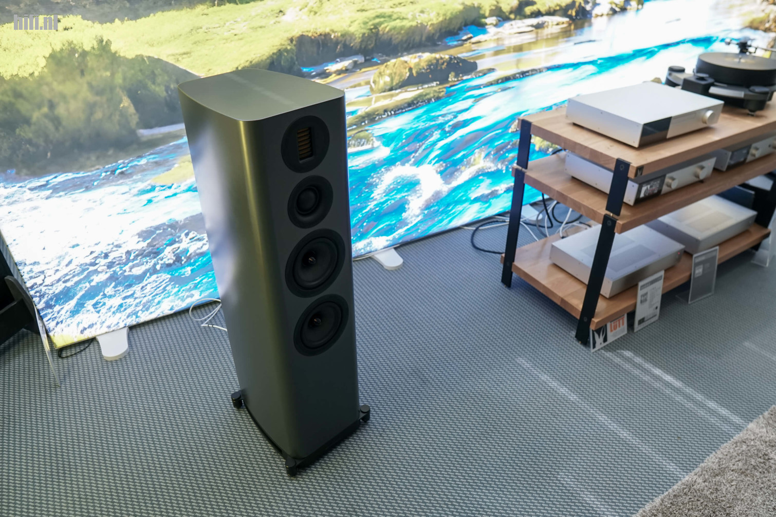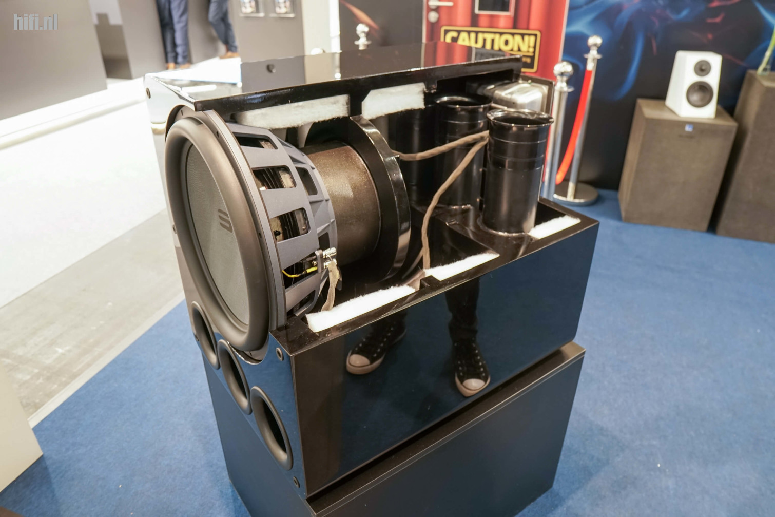 Zoals wel op meer stands van luidsprekerbouwers, was er een dwarsdoorsnede van de speaker voorzien. Tijdens een kort gesprek met de ontwerper trok vooral de aparte honinggraatstructuur van de tussenschotten in de speaker de aandacht. Meestal wordt voor bracing net iets heel solide gezocht, hier wordt de stevigheid vooral uit een slimme structuur gehaald. Er zit veel techniek in de speakers van dit merk, wat niet zo opvalt als je hun gestroomlijnd design ziet.