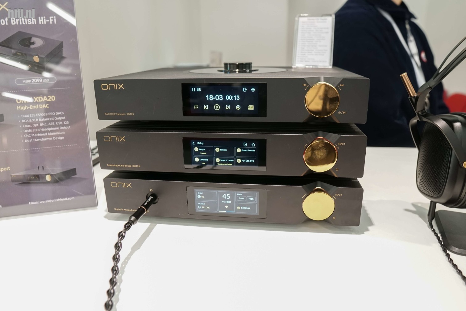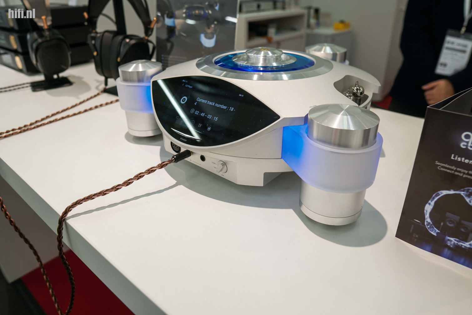 Het Britse merk Onix is wellicht de meeste lezers niet zo bekend. Het was in de jaren tachtig dan vooral groot in eigen land. Het bestaat nog altijd, maar op een bepaald punt nam Shanling een licentie op de naam. Op de beurs kwamen we zo een volledig setje Onix, met bovenaan een top-loading SACD-speler die via USB een DSD-stroom naar een DAC kan sturen. Dat lijkt een behoorlijk uniek gegeven, dat ook een prijs draagt van meer dan 2.000 euro. Met z’n opvallende gouden knoppen zijn de zwarte Onix-toestellen (er is nog een DAC en een streamer) nogal opvallend. Maar niet zo in het oog springend als de Shanling CD-T35. Het heeft iets weg van een metalen UFO op drie poten, mede dankzij het blauwe licht dat langs die poten schijnt.