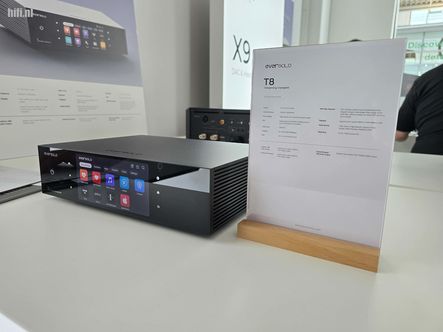 Nog op de Eversolo-stand waren verschillende nieuwe producten te signaleren, waaronder de T8 streaming transport (foto rechtsboven) en de Z10 DAC. Bij die laatste gebruikt Eversolo niet de AKM- of ESS-chips waar het gewoonlijk voor kiest voor een AKM-chip, met zoals wel vaker bij het merk een R2R-volumeregeling. Hier zie je op het scherm niet de gebruikelijke app-interface, maar een soort flowchart die het conversieproces in beeld brengt.