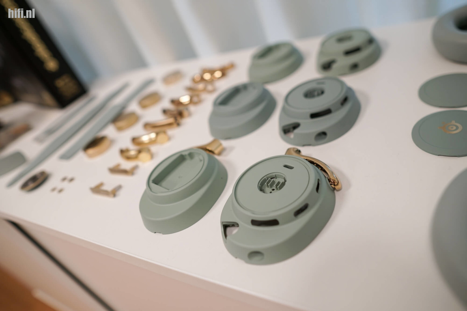 Wijzend naar een reeks onderdelen – behuizing, beugeldelen, en meer – die op een tafel achter hem liggen, laat Brian zien wat die vier jaar juist inhoudt. “We hebben het design doorheen die tijd geëvolueerd, dit zijn enkele van de vorige iteraties op weg naar de twee versies van het finale product. De Arctis Nova Elite is er uiteindelijk in twee heel andere kleuren. De volledig zwarte versie is heel strak en sportief, zonder zaken die gaming-headsets vaak net heel opvallend maken. Wie toch wil opvallen, kan voor de Sage Green-uitvoering aan. Het zijn vooral de matgoude kleur van de L-vormige beugel die hier in het oog springt. En het contrast met het groen natuurlijk.