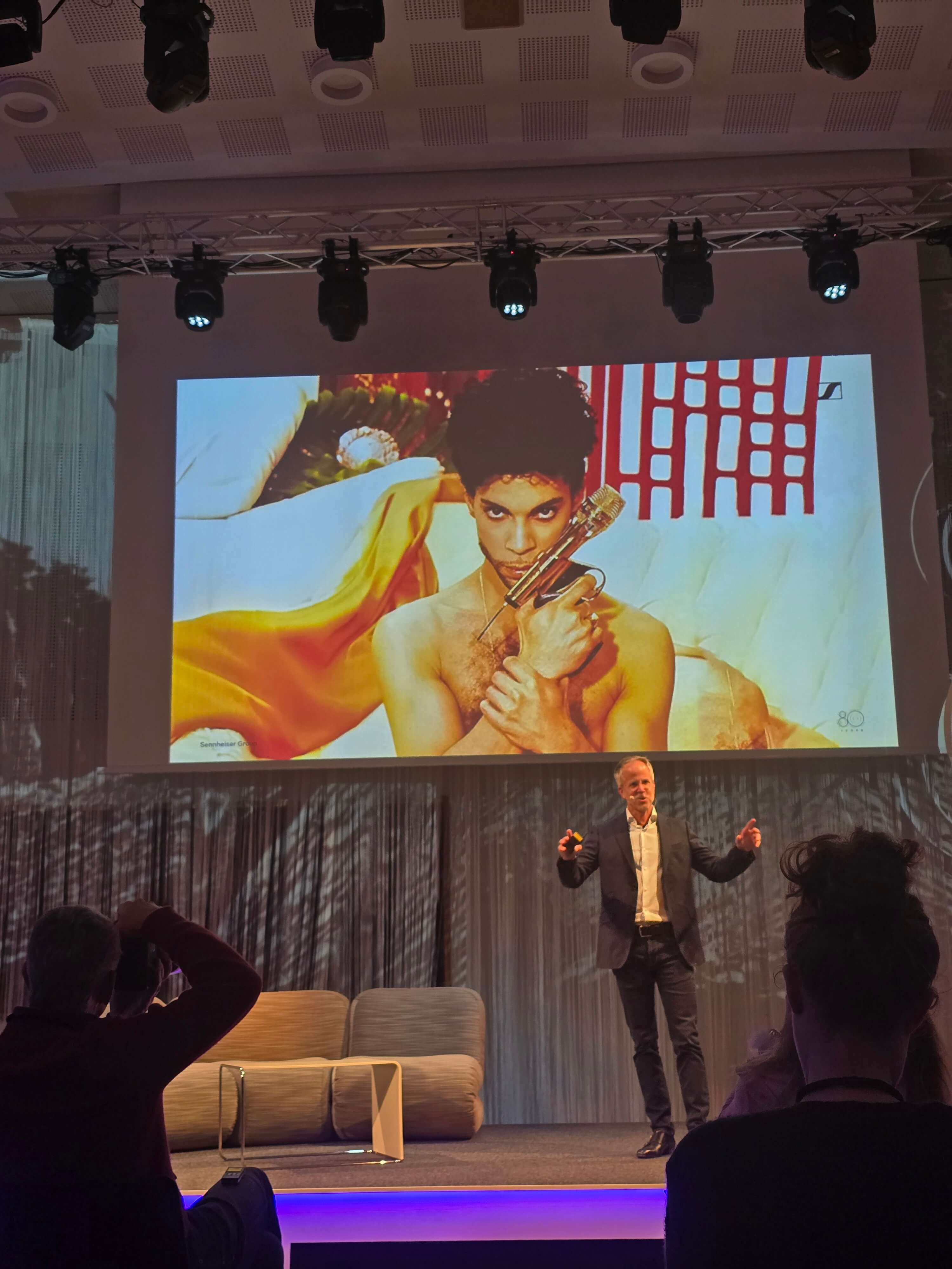 Bij aankomst worden we verwelkomd door dr. Andreas Sennheiser. In zijn openingswoord reflecteerde de kleinzoon van de oprichter – samen met zijn broer co-CEO van het familiebedrijf dat nog altijd volledig in eigen bezit is – op die tachtig jaar geschiedenis. Het blijkt vervolgens niet heel moeilijk om een pakkende presentatie te maken als je als merk terug kunt blikken op de 'I have a dream'-speech van Martin Luther King, of 'Ich bin ein Berliner' van JFK en 'Mr Gorbatsjov, tear down this wall' van Ronald Reagan – alle drie uitgesproken in een Sennheiser microfoon. En dan hebben we het nog niets eens over die beroemde 'gun mic' van Prince, custom made voor de muzieklegende.