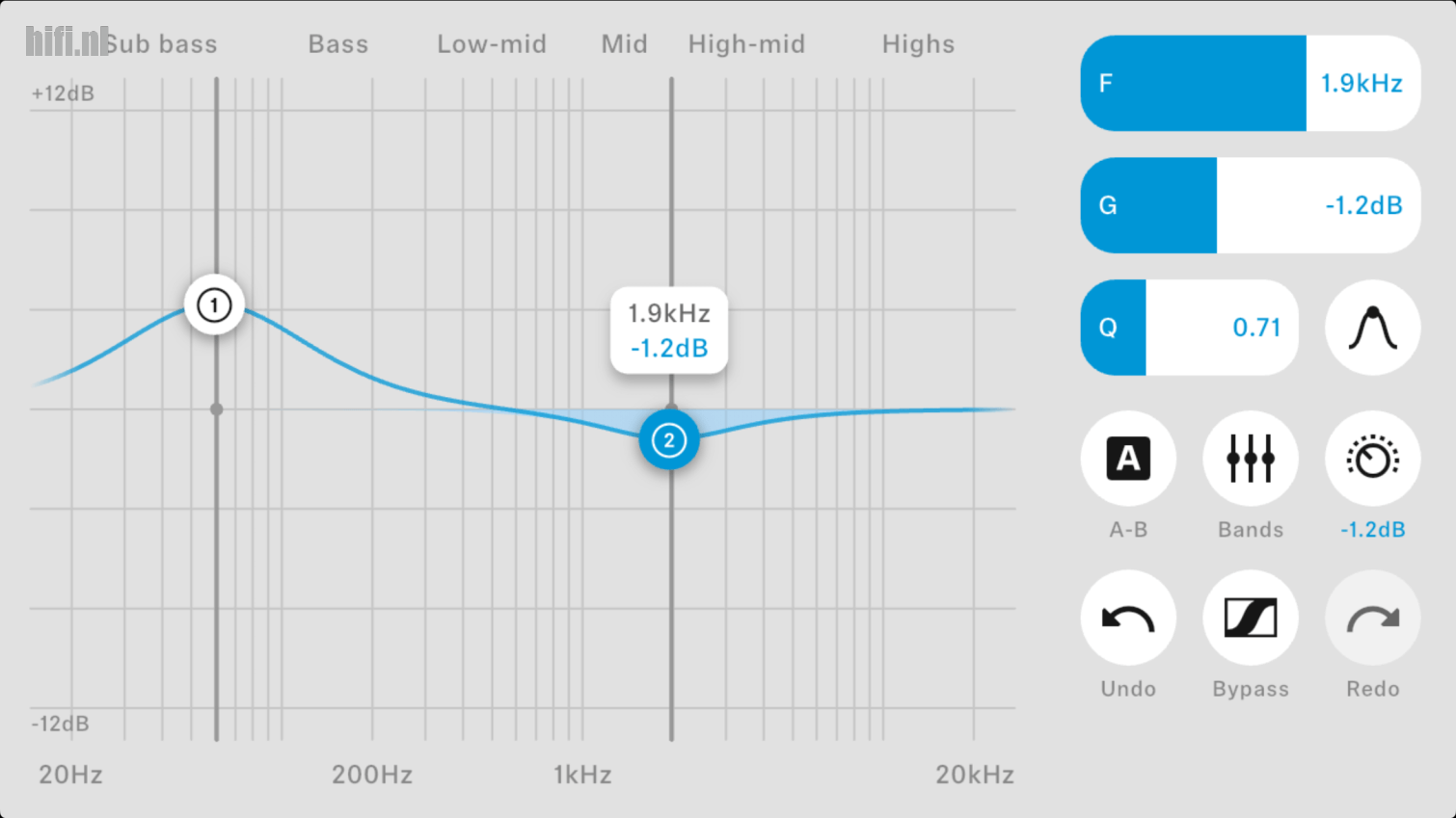Als je ervoor kiest om helemaal zelf de klank te tunen, krijg je een uitgebreide equalizer voorgeschoteld. Naast geavanceerde instellingen (je kunt frequentie, piekwaarde en Q door te slepen of via schuifbalken instellen), kun je A/B vergelijken tussen twee curves of vergelijken met de standaard Sennheiser-sound.