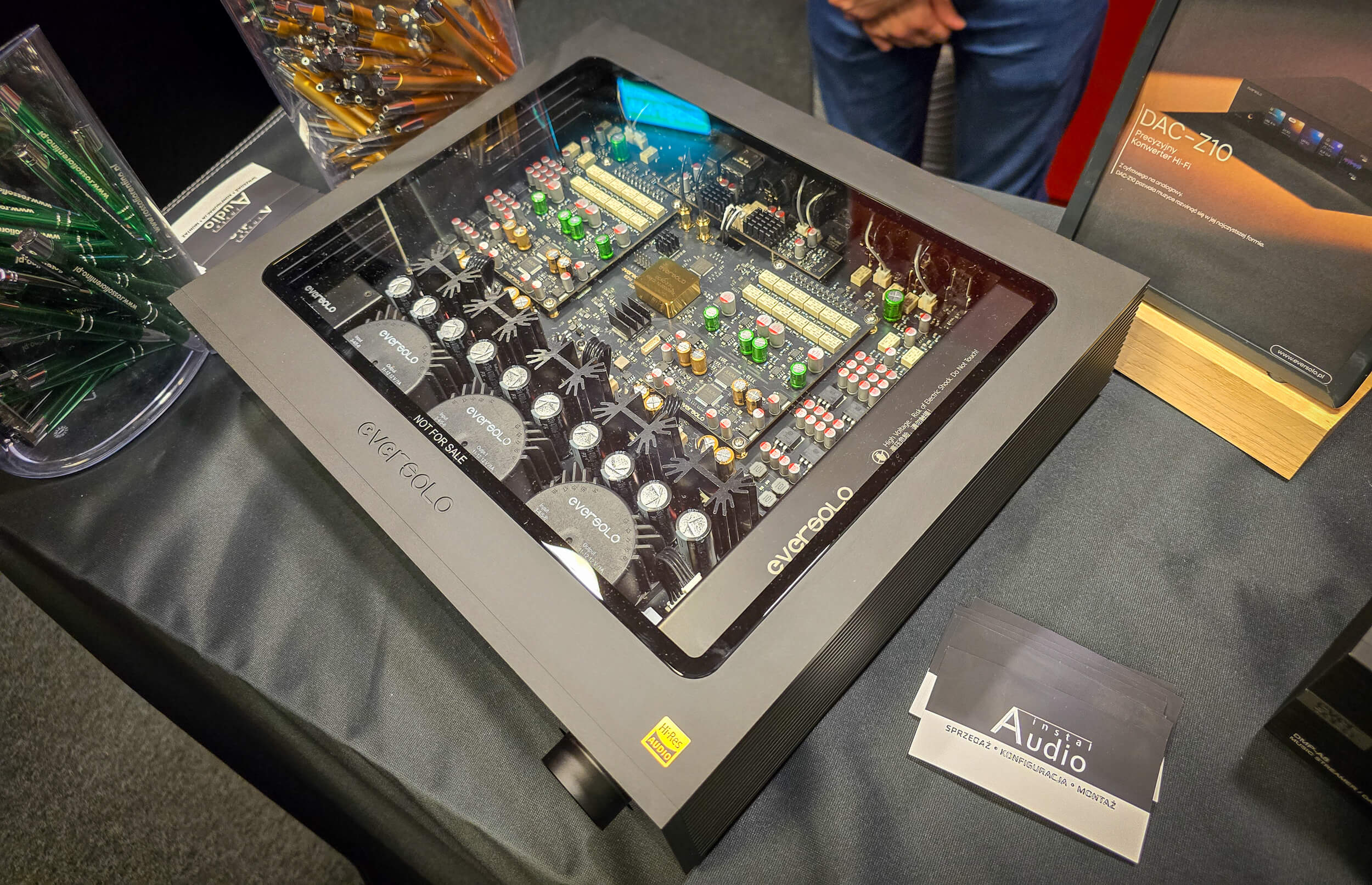 Eversolo gebruikte de Warschau-show (en de Parijs-beurs op hetzelfde moment) als de plaats om z’n DMP-Z10 DAC voor te stellen. Het is het vlaggenschip-DAC van het Chinese merk, op basis van twee AKM 4191EQ-AK4499EXEQ-chipsets en drie lineaire voedingen (je ziet ze onderaan de foto).
