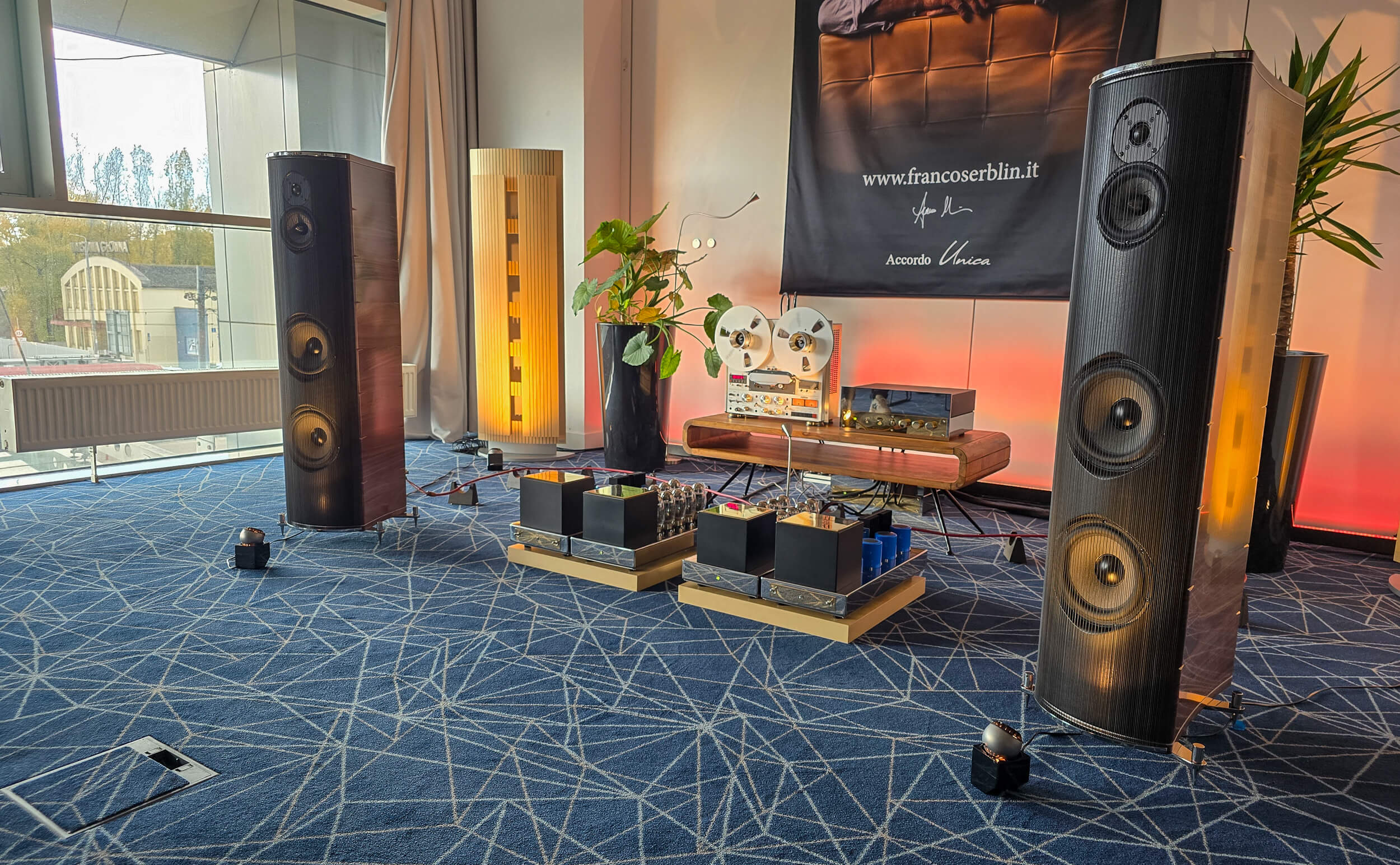 De Golden Tulip huisvest maar een tiental ruimtes, waaronder traditioneel wat ongewonere systemen. Wat ons betreft waren er twee die echt uit de band sprongen: een systeem van Franco Serblin op de eerste foto (met Jadis-versterking en een fraaie Revox-tapedeck)...