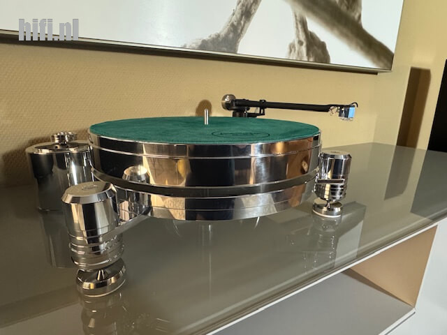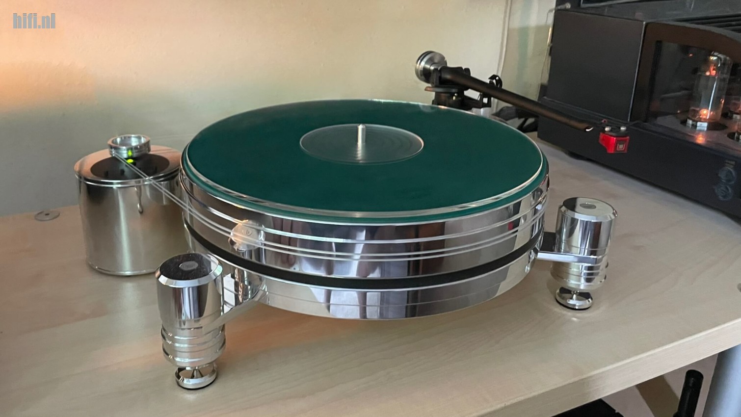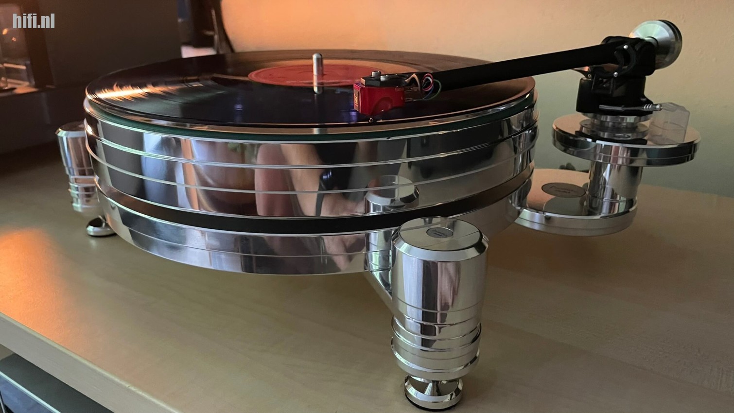 Ik vond de Solid 110 Metall, hier op de foto, destijds al een elegante verschijning, maar de aanzienlijk zwaarder uitgevoerde Solid 311 Metall vind ik optisch nóg mooier in balans. De speler straalt niet alleen luxe en degelijkheid uit, als je hem met de meegeleverde witte handschoenen uit de doos tilt heb je ook echt wel wat in je handen. De Solid 110 Metall weegt 12 kilo zonder arm, en het 35 millimeter dikke plateau weegt 7,5 kilo. De drie spikes waar de speler op staat zitten vrij dicht bij elkaar direct onder het plateaulager. Niet dat de speler daar wankel door staat, maar de Solid 311 die ik hier bespreek brengt qua totaalgewicht maar liefst 24 kilo in de schaal, met een 4 centimeter dik plateau dat 8 kilo weegt, en de drie van verstelbare spikes voorziene poten staan bovendien helemaal buiten het plateau, wat toch een aanzienlijk stabielere indruk geeft. Drie metalen onderlegschijfjes met gecentreerde uitsparing en een krasvrije vilten onderkant worden meegeleverd. Ook de Solid 311 Metall is voorzien van een dubbele precisiesnaar die gemaakt is van een mix van nylon en siliconen. De uit edelstaal gedraaide en gepolijste as van het plateaulager rust in de van olie voorziene lagerput op een gepolijste keramiekkogel, die op zijn beurt weer op een taatsplaat van robijn ligt. Hier is echt niets aan het toeval overgelaten.