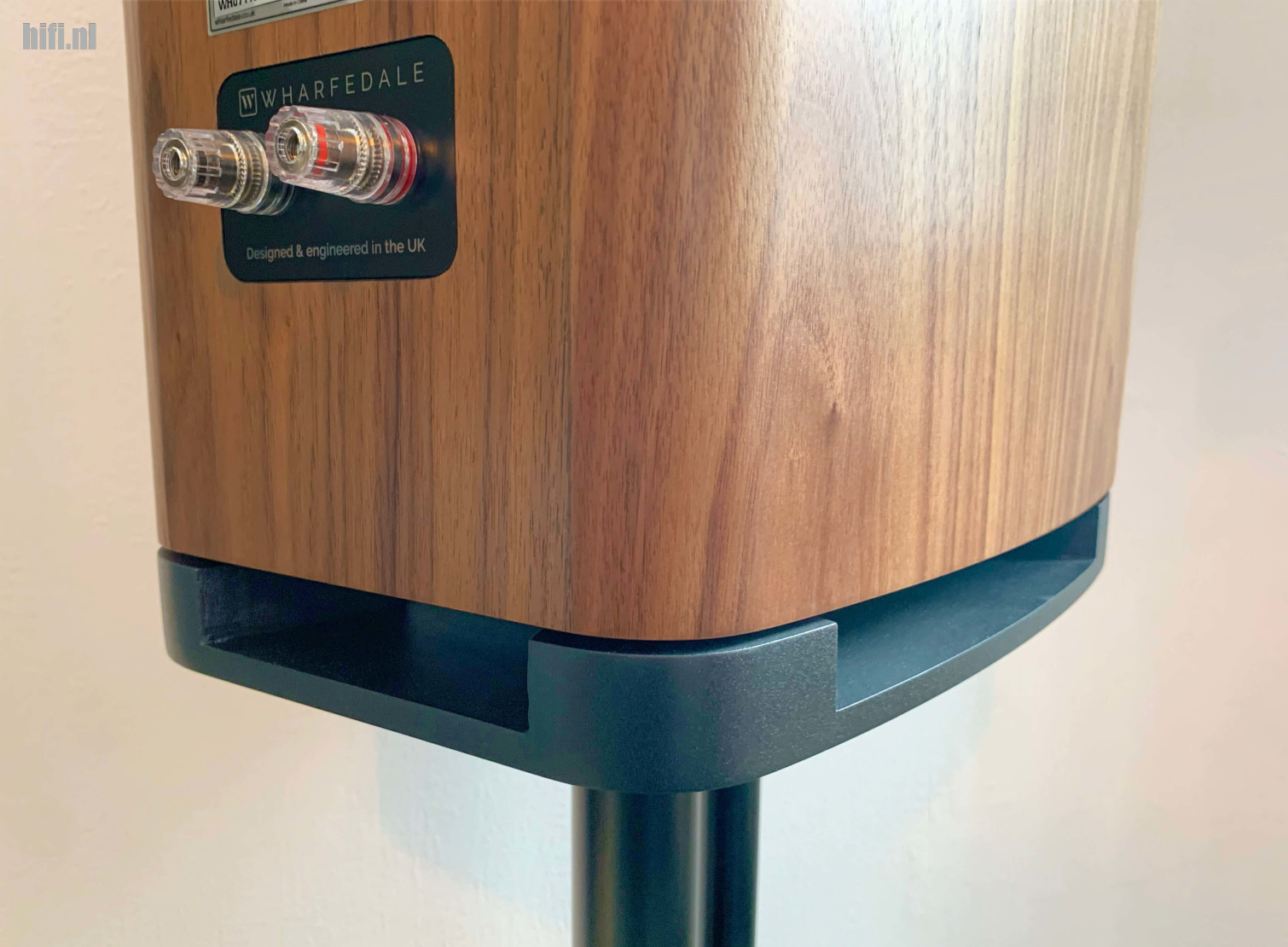 De basis van de EVO 5.2 wordt gevormd door wat Wharfedale een hybride plint noemt. De gekozen combinatie van metaal en hout moet voor vergrote stabiliteit zorgen. De plint bevat links, rechts en aan de achterkant openingen om de lage tonen uit de down-firing basreflexpoort naar buiten te leiden, zoals op deze foto te zien is.