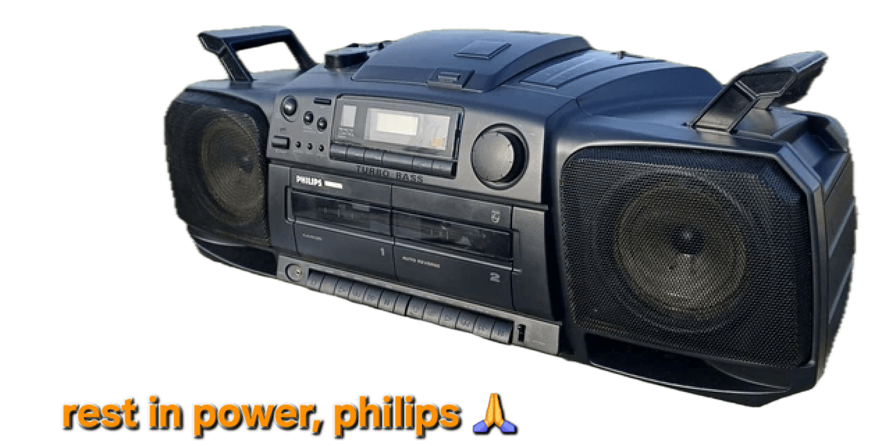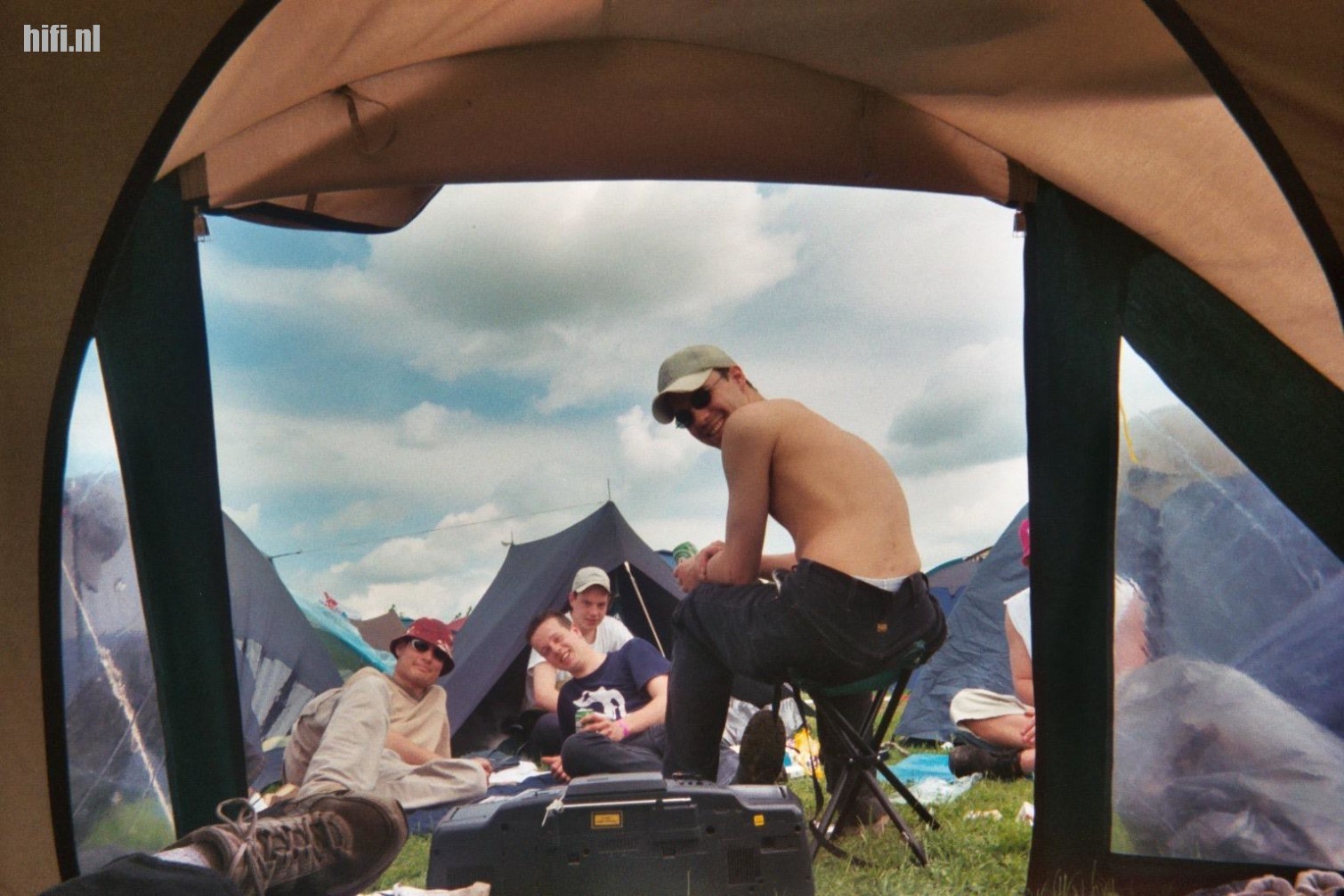 Op deze foto uit eigen doos ziet u de festivalcamping van Pinkpop ergens aan het begin van deze eeuw en, belangrijker, onze geliefde batterijverslindende Philips AZ8404 ghettoblaster waarmee je de buren zestig, zeventig tenten diep – in iedere windrichting – wakker kon houden.