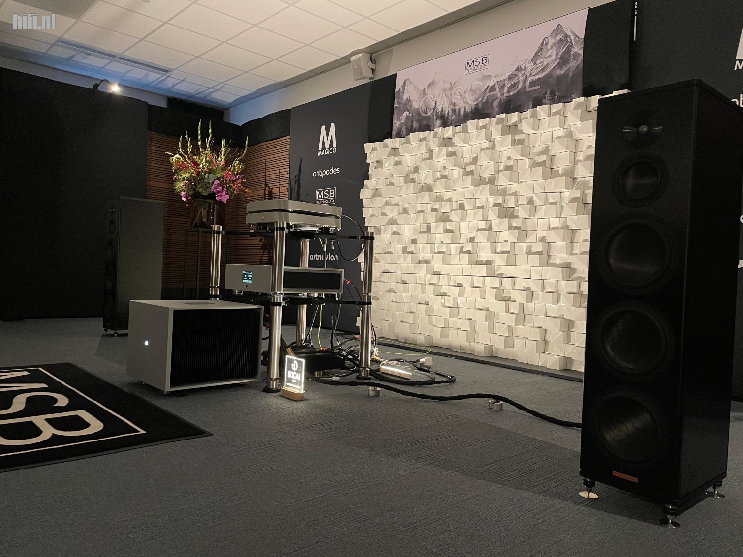 Ruimte 64 is door de Antwerpse audiospecialiten fraai aangekleed en voorzien van de nodige akoestische aanpassingen om de set volledig tot z’n recht te kunnen laten komen. Dat mag ook wel, want wat er staat is bepaald niet misselijk. Een immense eindversterker van het door deze importeur nieuw verworven merk Pilium stuurt een set Magico A5 luidsprekers aan, de Antipodes muziekserver via de nieuwe MSB Technology ladder-Dac OP D De Pilium Ares veerversterker verzorgt de muziek.