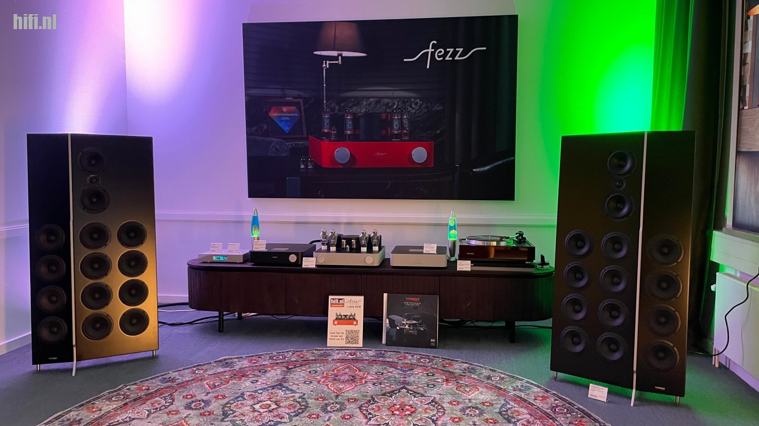 In de sfeervol verlichte ruimte van Penhold (118) zijn twee prachtige noviteiten te beluisteren. Penhold heeft kort geleden de distributie van het Poolse buizenmerk Fezz Audio verworven. Hun Lybra 300B staat verrukkelijk te spelen op een paar zeer bijzondere, door de Duitse luidsprekergoeroe Joachim Gerhard ontworpen Thorens Soundwall HP 600 luidsprekers. Ondanks de relatief kleine ruimte klinken de luidsprekers beheerst en transparant, maar niet spectaculair. Een set waarmee je dus urenlang relaxed van muziek kunt genieten.