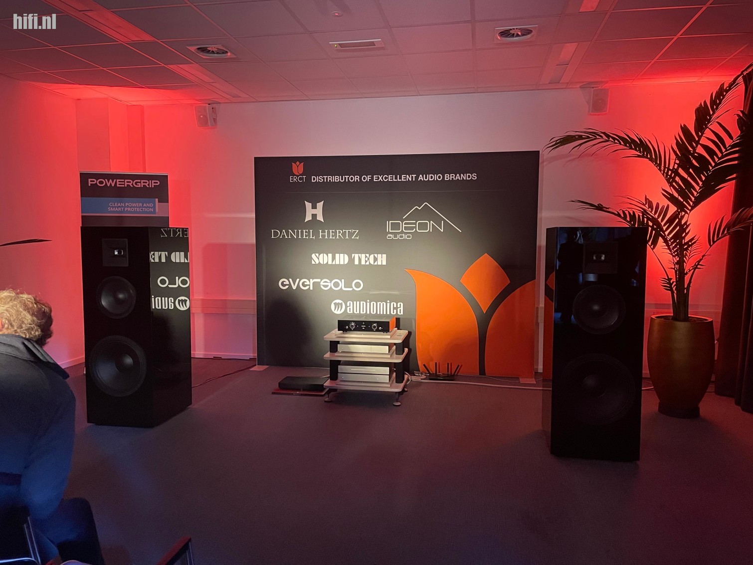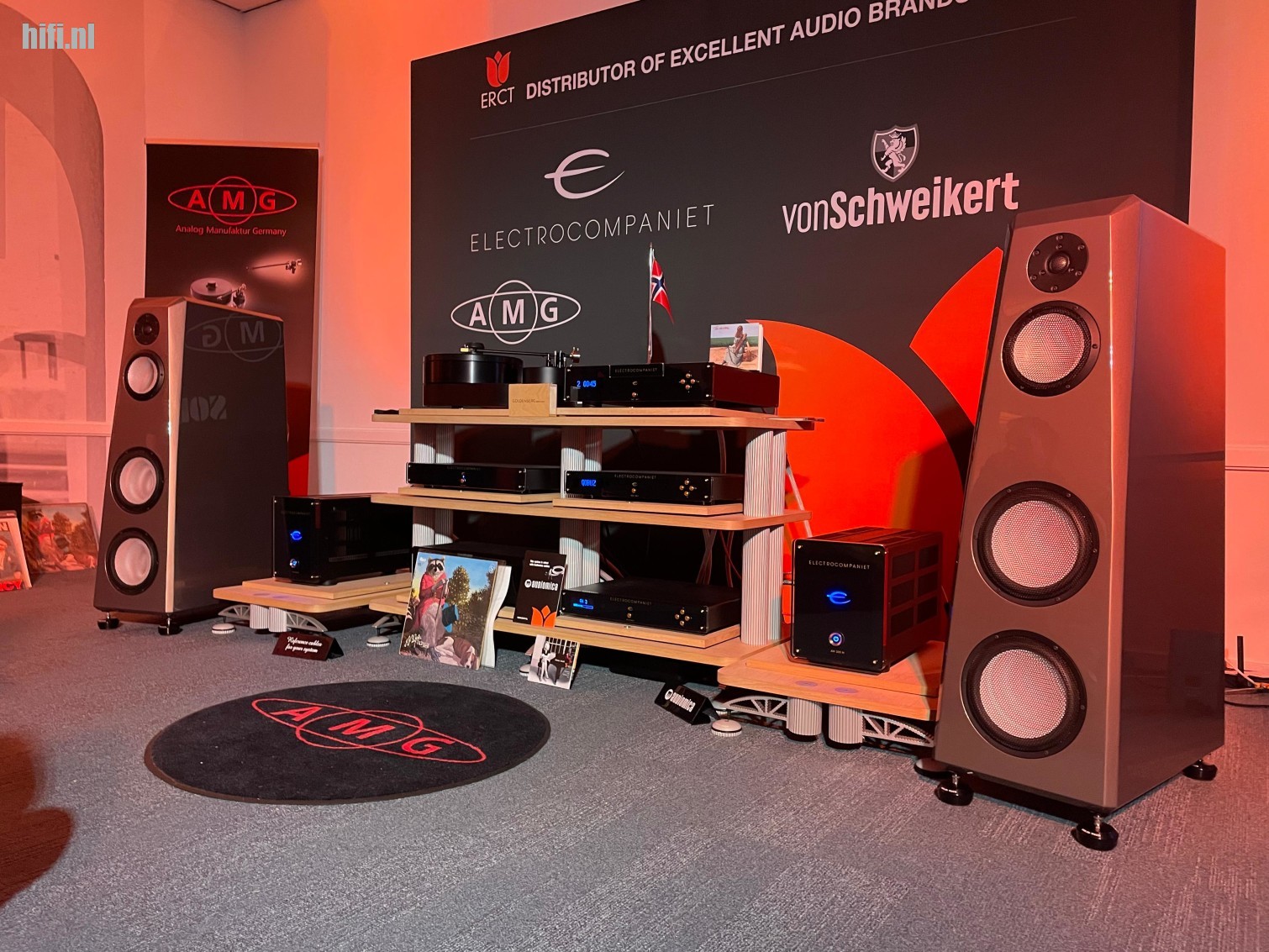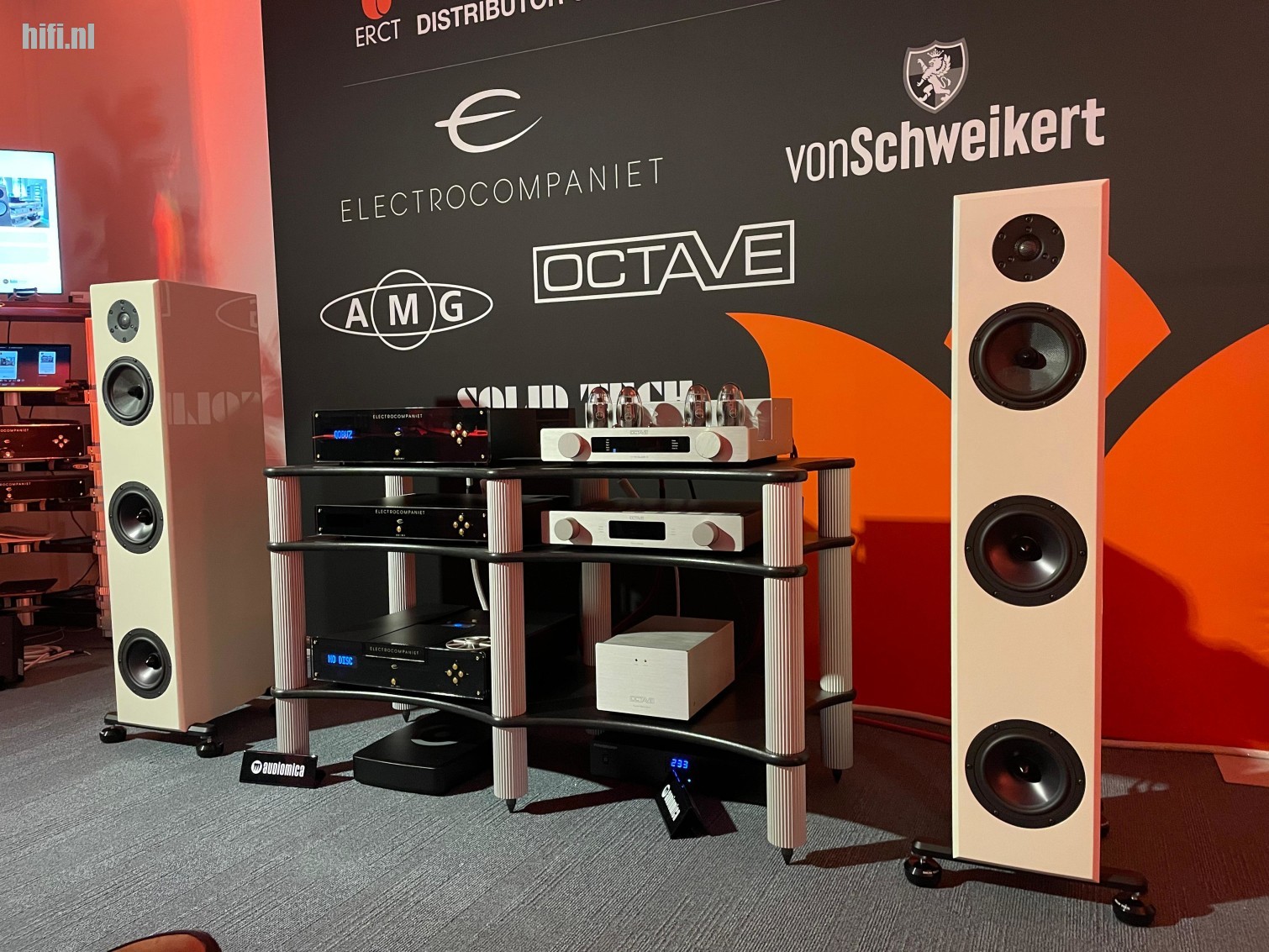 Distributeur ERCT beschikt over drie kamers waarin de merken (*ademt in*) AMG, Audiomica, Daniel Hertz, Davis Acoustics, Electrocompaniet, Eversolo, Goldenberg, Ideon, Norma Audio, Octave, Solid Tech, Thales en Von Schweikert (*ademt uit*) aan het publiek worden gedemonstreerd.