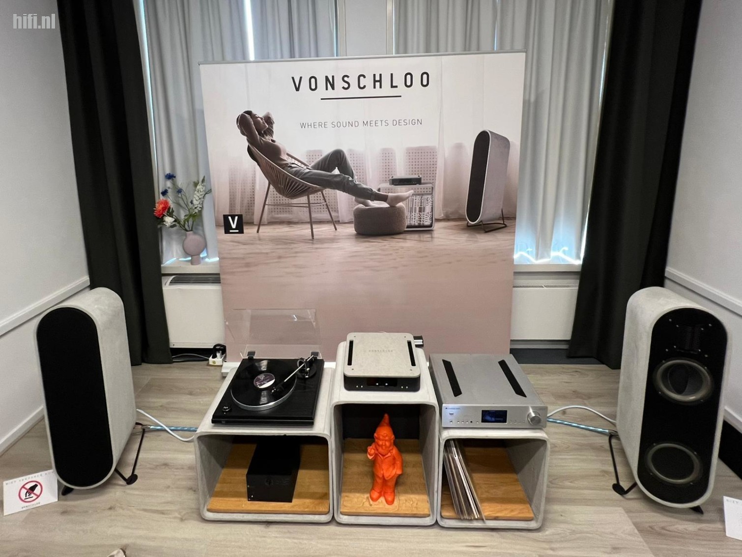 In kamer 12 presenteert het Zwitserse Vonschloo met de hand vervaardigde L10 vloerstaanders en de compacte SmartAMP versterker. Deze luidsprekers hebben een tijdloos vormgegeven design. Het ontbreken van een crossover, het gebruik van speciaal voor deze luidsprekers ontwikkelde drivers en het gebruik van inert vezelcement leveren de Vonschloo L10 luidsprekers een transparante en ongekleurde muziekweergave. De Lineair Motion Tweeter heeft een volledig vlakke membraan is vervaardigd uit een harsgedrenkt natuurvezel. Hiermee levert de tweeter een hoge impulssnelheid en een fraaie spreiding in het hoog.