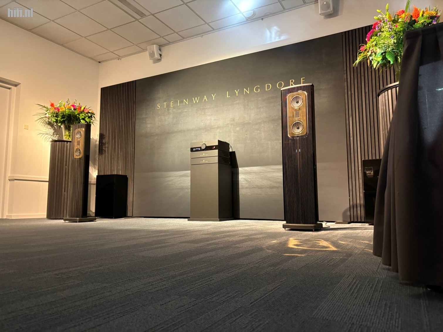 Het merk Lyngdorf is ook al jarenlang terug te vinden in dezelfde ruimte. We openden het bal gisteren zo ongeveer met nieuw merk Radiant Acoustics van Peter Lyngdorf en co, maar ook in de welbekende lange ruimte is Steinway Lyngdorf en 'gewoon' Lyngdorf van de partij. Op het podium een heuse primeur zelfs: de Lyngdorf Model C MKII, aangevuld met twee Steinway LSR-212's. De vloerstaande dipolen met vergulde fronten zijn een echte eye-catcher.