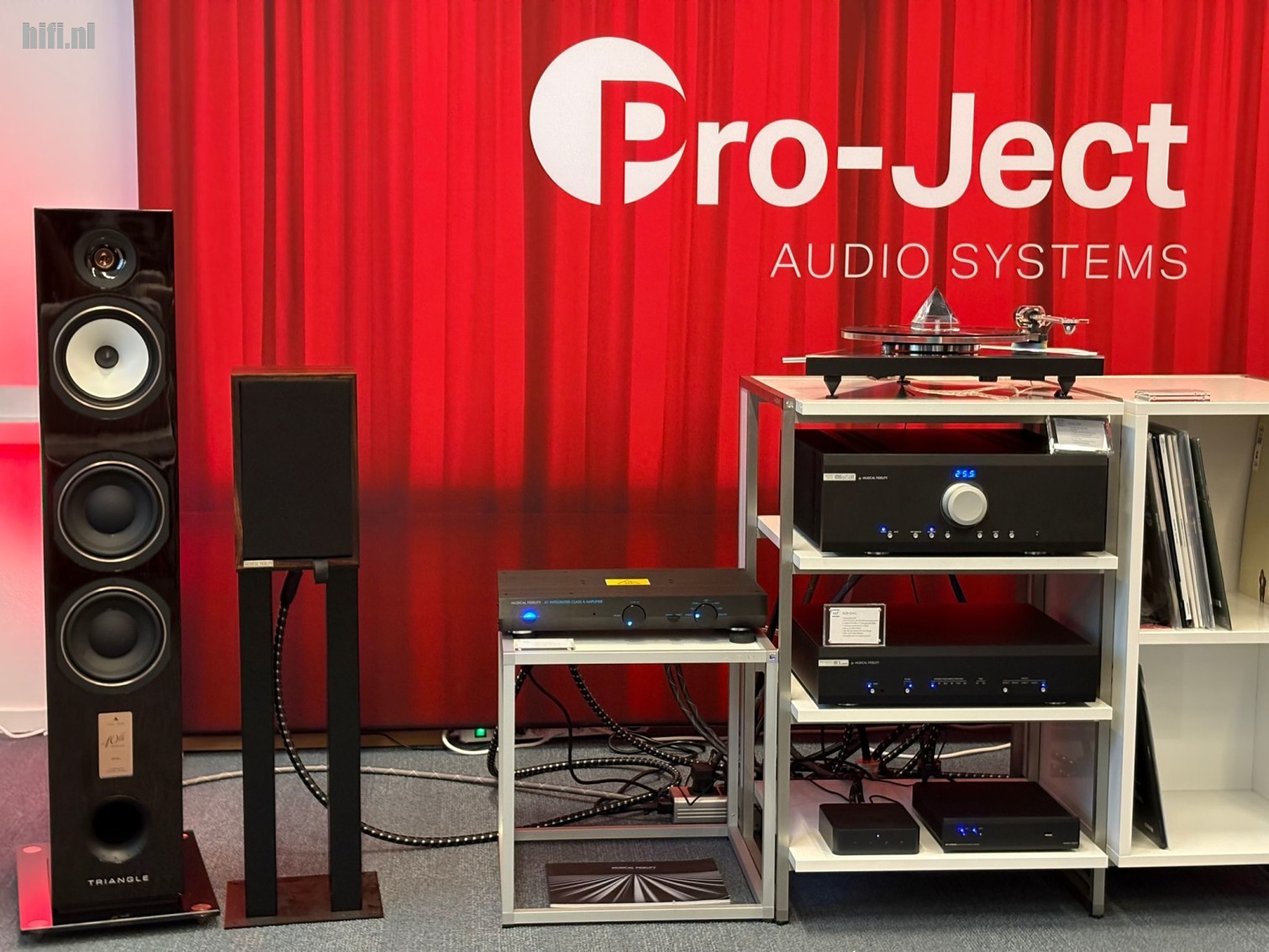 In ruimte 52 vinden we de merken Austrian Audio, Musical Fidelity, Pro-Ject en Triangle. De enorme ruimte is opgesplist met een high-end set van Musical Fidelity, en aan de andere kant een Pro-Ject opstelling.