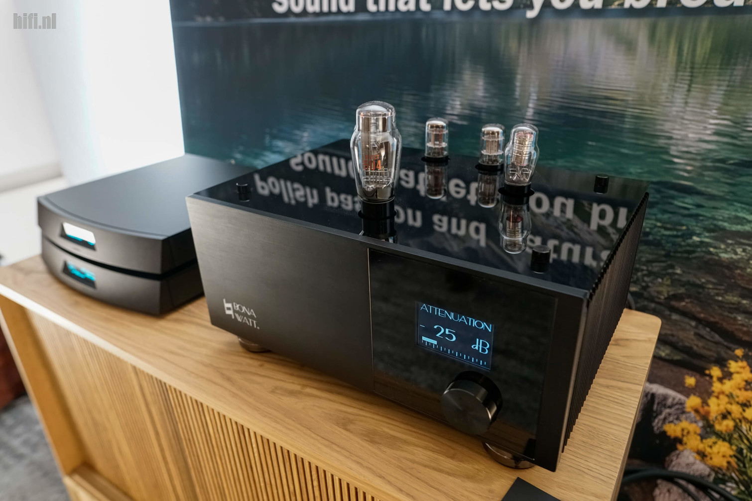 Elders op de show kon je de nieuwe Triton-versterker van het Poolse Bona Watt bewonderen in een verrassend stijlvol goud. Hier is deze hybride versterker gekoppeld aan een streamer van Lumin, die de optionele interne DAC-kaart van MuzgAUDIO in de Triton aanstuurt.