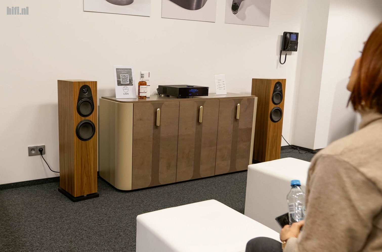 Linn hield het heel eenvoudig, zoals wel vaker op audioshows. Of toch bij deze opstelling. Iets verder trok het Schotse merk alle registers open. Hun grote Klimax 500 monoblokken aangestuurd door een Select DSM hingen daar muziek te spelen via de opmerkelijke Concentro M807 van ELAC (de speaker met zes midrange-drivers rond een tweeter, weetjenog?). En ja, een fles Schotse whiskey hoort er altijd bij.