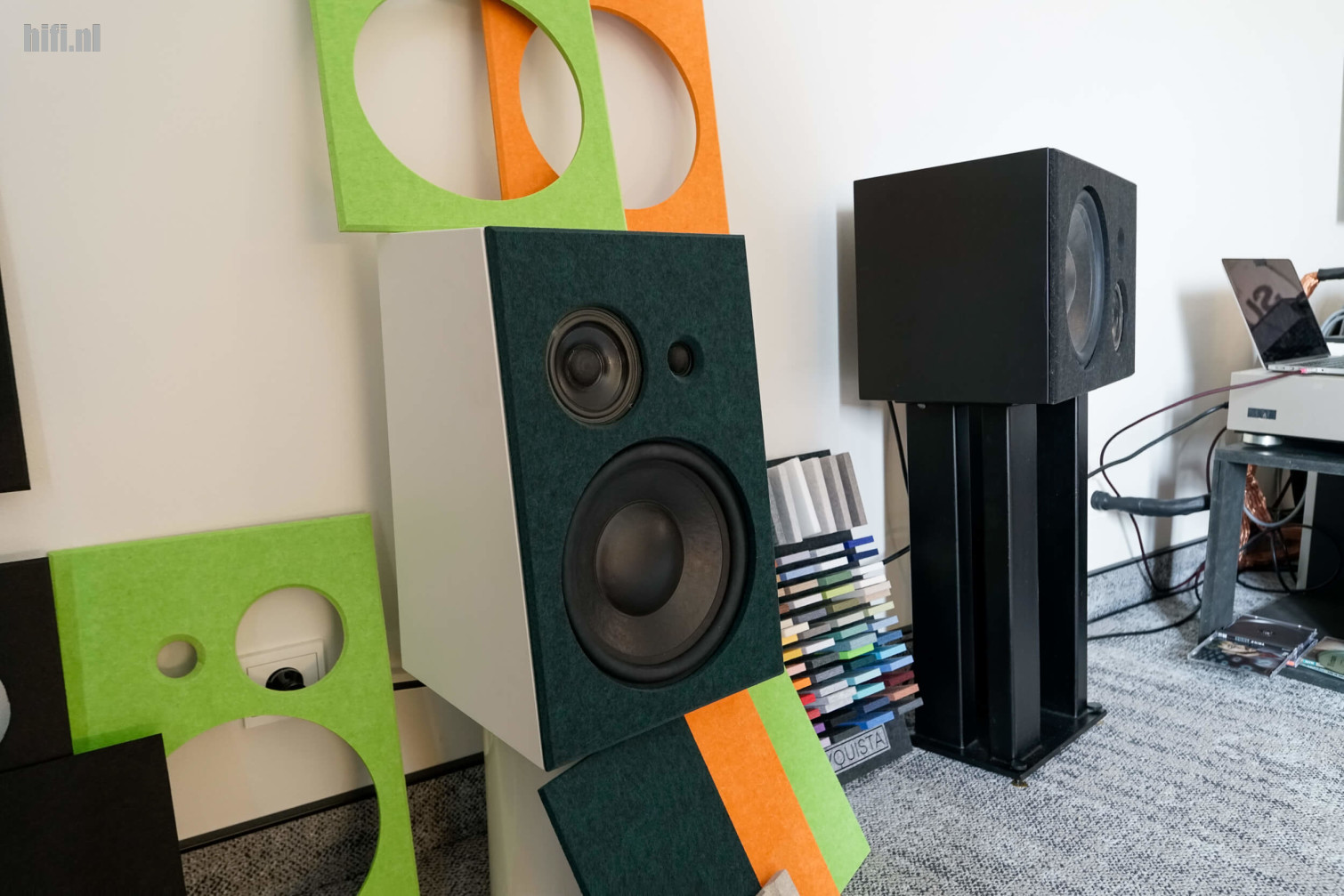 In deze kamer van Sugden kwamen we deze speakers tegen. Het is niet helemaal duidelijk hoe het verhaal zit, maar de stoffen baffles die je hier ziet zijn afkomstig van Nyquista, een firma gespecialiseerd in akoestische behandelingen en accessoires die op de show wel meer kamers onder handen nam.