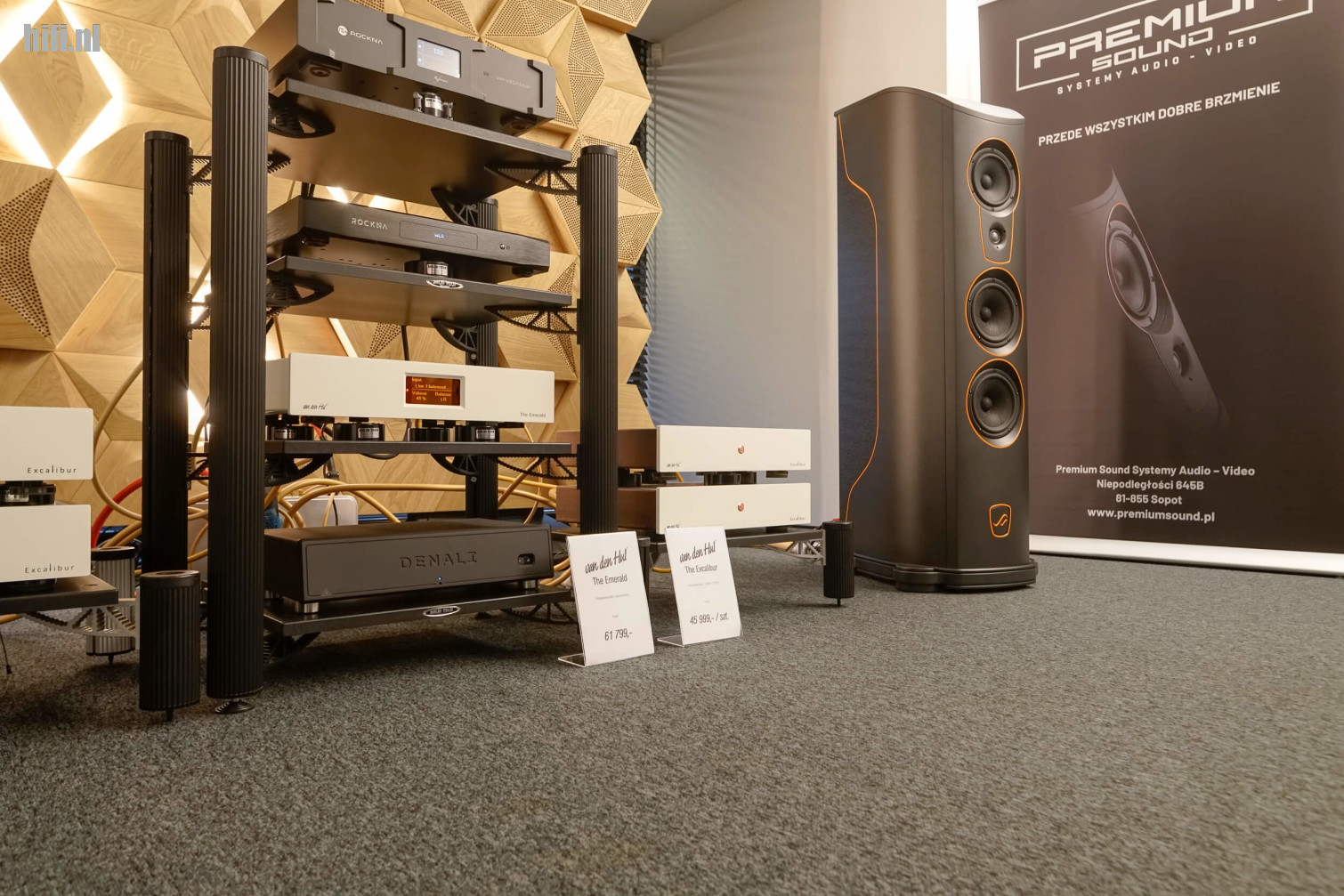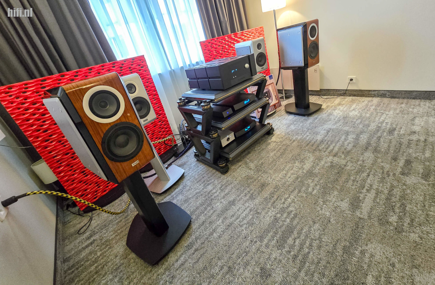Een stapel MOON-toestellen uit de North Collection maakte fraaie muziek op deze grote TD 3.10's en de fijnere X2t Anniversary van Raidho. De kamer was iets ruimer dan de breedhoekfoto overbrengt, maar het neigde hier wel naar nearfield-listening als je vooraan zat. Niettemin, mooi gecombineerd van de Poolse distributeur, want het klonk hier prima.