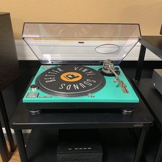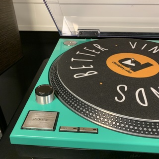 De gehele bovenplaat is vervangen door deze duidelijke groen/blauw gekleurde variant die de platenspeler een uniek karakter geeft.