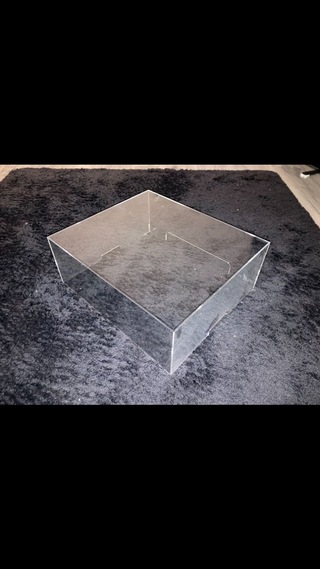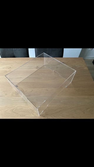 Deze stofkap past over een platenspeler heen. Links en rechts zit een uitsparing waar de handen geplaatst kunnen worden om de stofkap op te tillen, aan de achterzijde zit een grote uitsparing voor kabels.