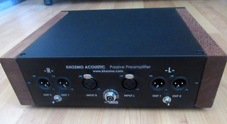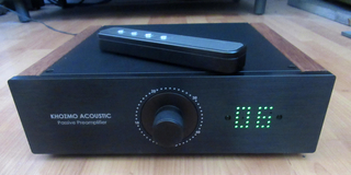 Gebalanceerde passieve voorversterker van het Poolse Khozmo. Volume is relaisgeschakeld in 48 stappen met een gelagerde metalen volumeknop. 10 KOhm ingangsimpedantie. Hij heeft Vishay weerstanden, die zeer neutraal geluid geven. Bezit één set XLR ingangsconnectoren en twee sets XLR uitgangsconnectoren, waartussen te schakelen is (ze functioneren niet gelijktijdig, ik had er een eindversterker en een koptelefoonversterker aan hangen). Met afstandsbediening. Het volume is zichtbaar via dimbare groene leds.